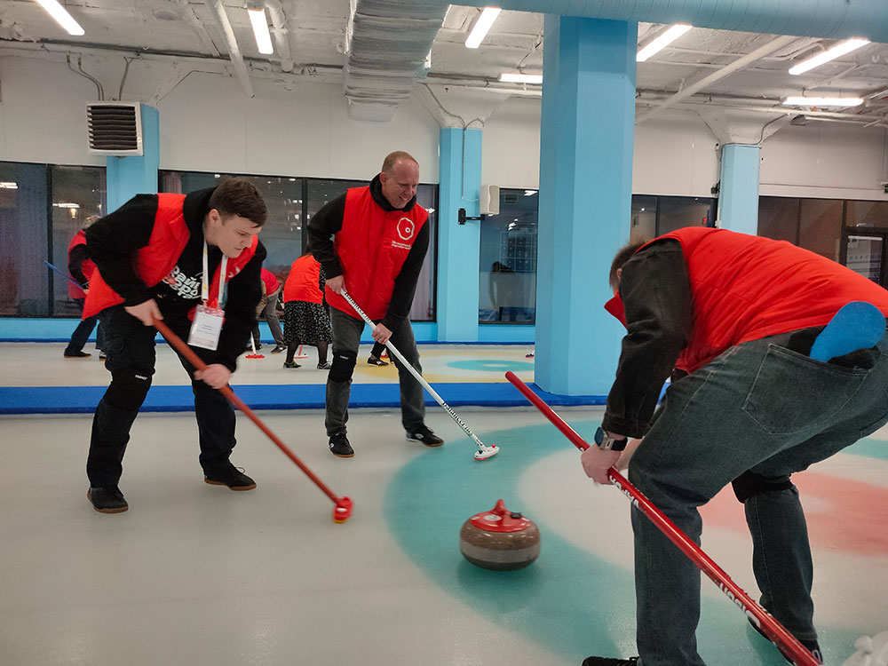 Слет-2025 проходил на площадке «Московского кёрлинг-клуба». После официальной части и вручения наград у всех желающих была возможность попробовать себя на льду. Устроили полноценный турнир с профессиональными инструкторами, судьями и наградной атрибутикой. Для большинства участников опыт игры в керлинг был новым, для всех без исключения этот опыт показался крайне увлекательным. На удивление динамичное и азартное занятие. Красные носы, громкие крики «три-три-три» и атмосфера спортивного соперничества царила между командами на всех трех дорожках.