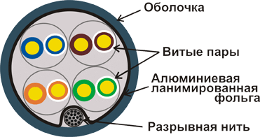 4 витых пары обернуты полиэтиленовой пленкой и вместе с медным заземляющим проводником заключены в общий экран из фольги и оболочку из PE (полиэтилен).