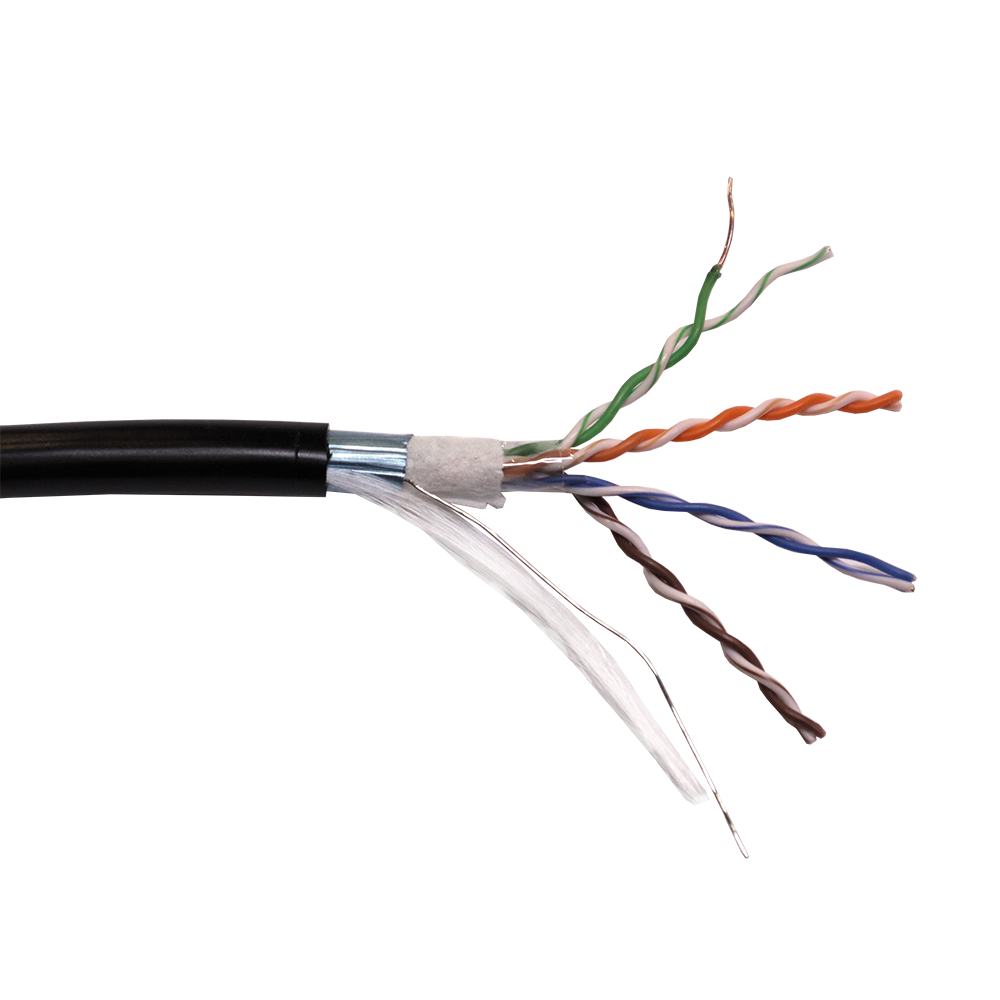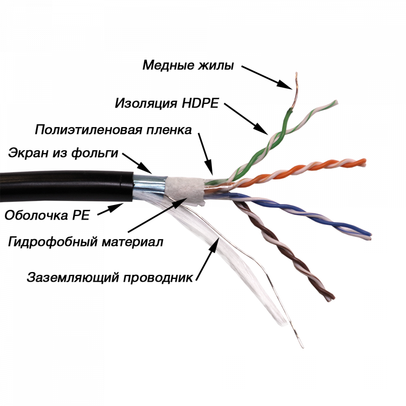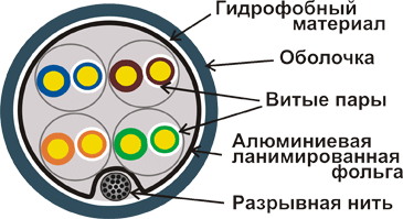 4 витых пары обернуты гидрофобным материалом и вместе с медным заземляющим проводником заключены в общий экран из фольги и оболочку из PE (полиэтилен).