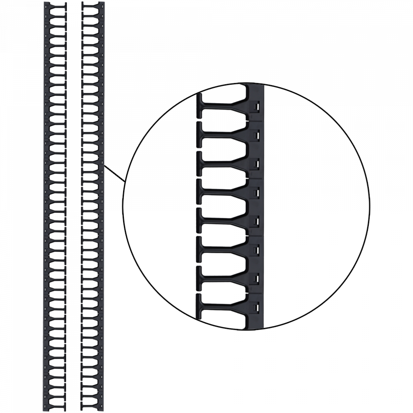 Распределение кабелей осуществляется за счет «пальцев»,расположенных с шагом 1U. Элементы изготовлены из армированного пластика,обеспечивают поддержку кабелей на уровне каждого юнита. Скругленная поверхность«пальцев» предохраняет оболочку кабелей от повреждений и обеспечивает требуемый радиус изгиба.