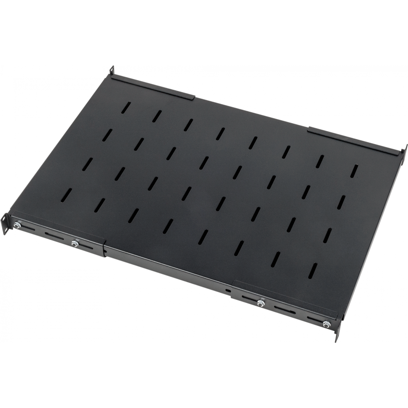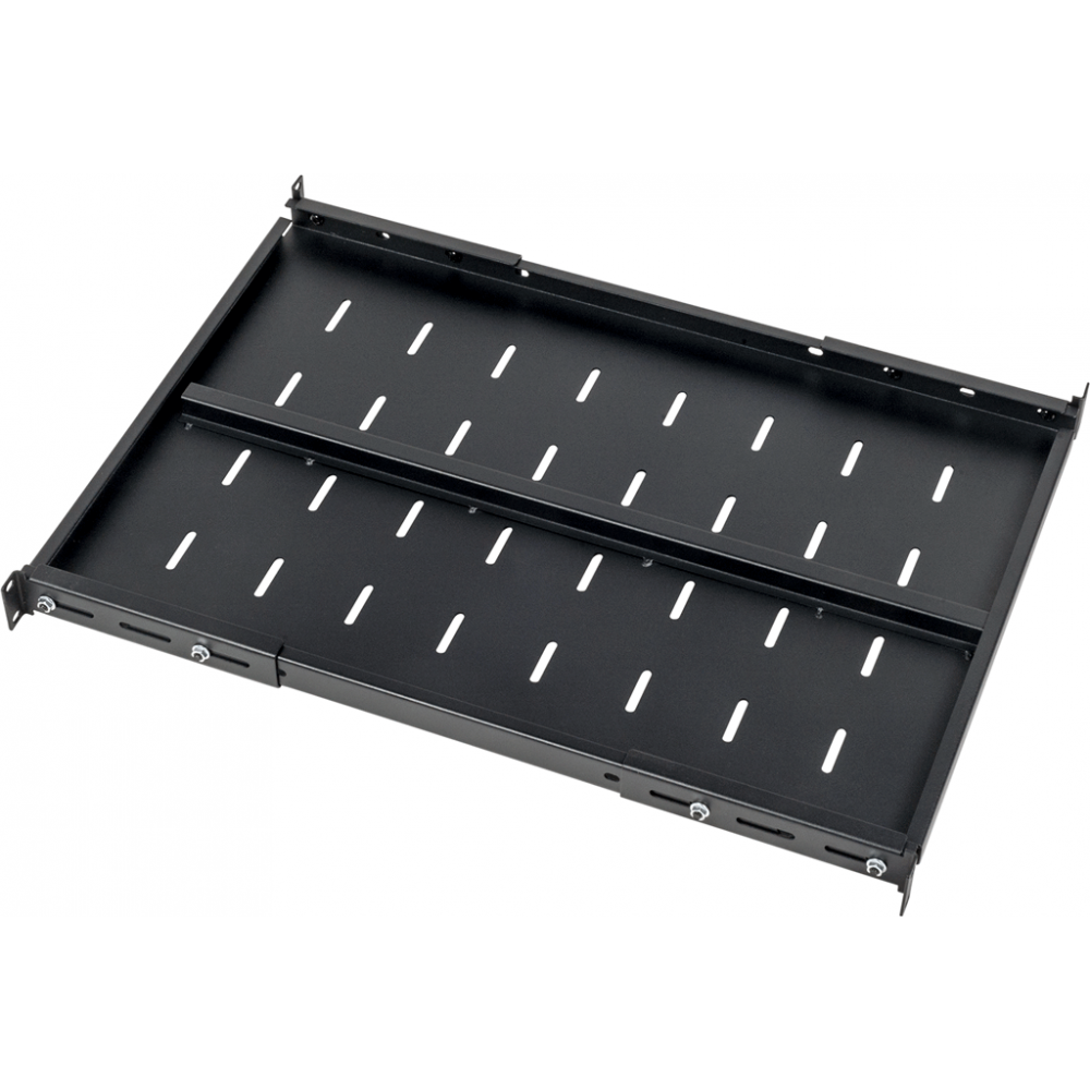 Перфорация полки обеспечивает дополнительную вентиляцию установленного на нее оборудования. Полка крепится в шкаф на боковых кронштейнах, положение которых может регулироваться.