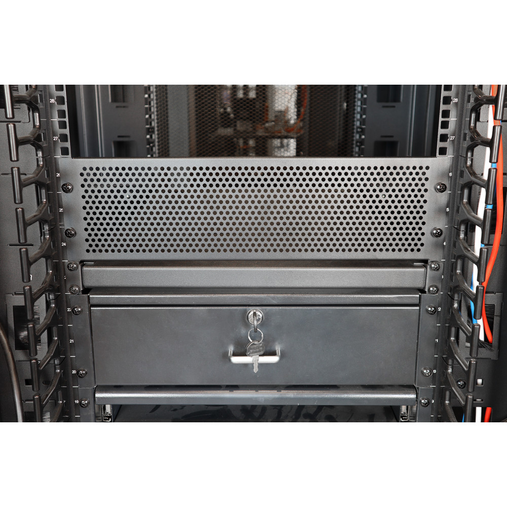 Установленные в незанятых оборудованием юнитах вертикальных направляющих вентиляционные панели, препятствуют механическому воздействию на кабельные каналы и установленное в шкафу оборудование. Перфорация при этом не препятствует свободной циркуляции воздушных потоков.