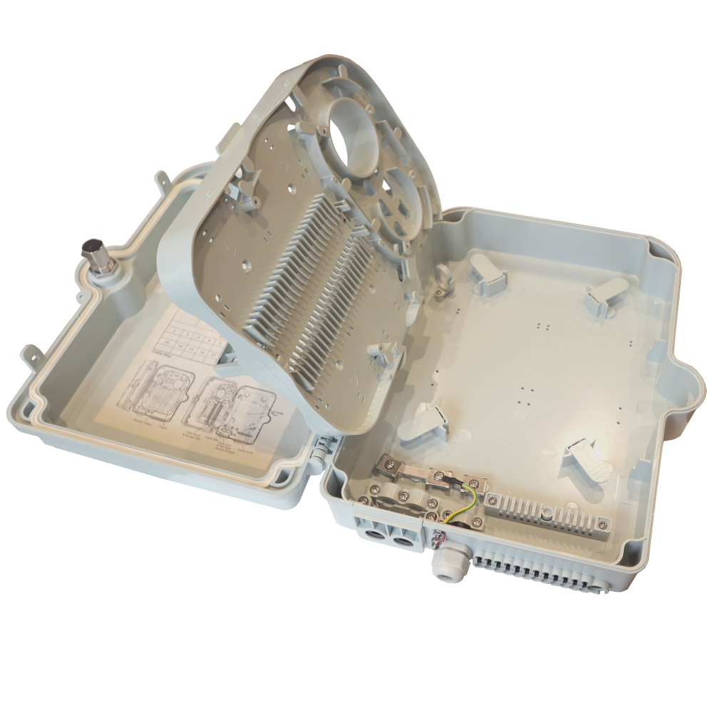 В нижней части корпуса расположены 3 ввода для магистральных кабелей и 24 ввода для drop кабелей. Вводы кабелей оснащены резиновыми уплотнителями. Ввод магистрального кабеля оснащен крепежом центрального силового элемента и прижимной скобой.