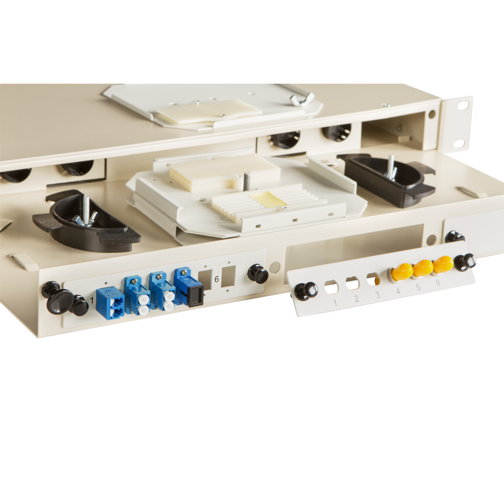 В зависимости от требований, можно приобрести адаптерные панели под установку адаптеров на выбор - SC, ST, FC, LC duplex, LC quad. Фиксация адаптерных панелей осуществляется с помощью пластиковых защелок.