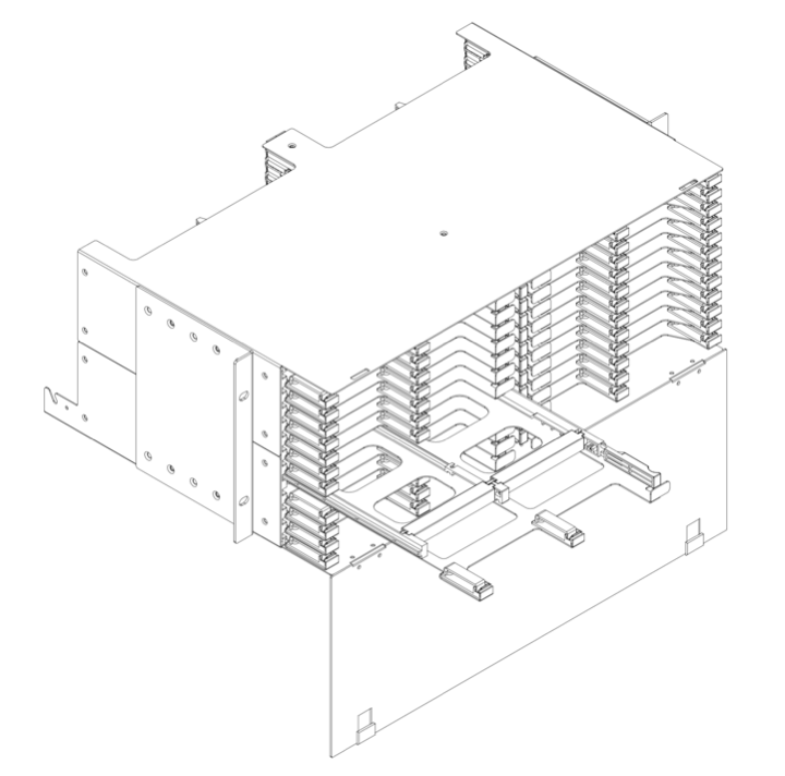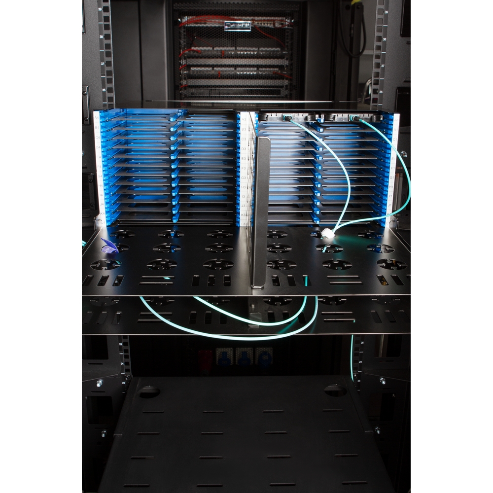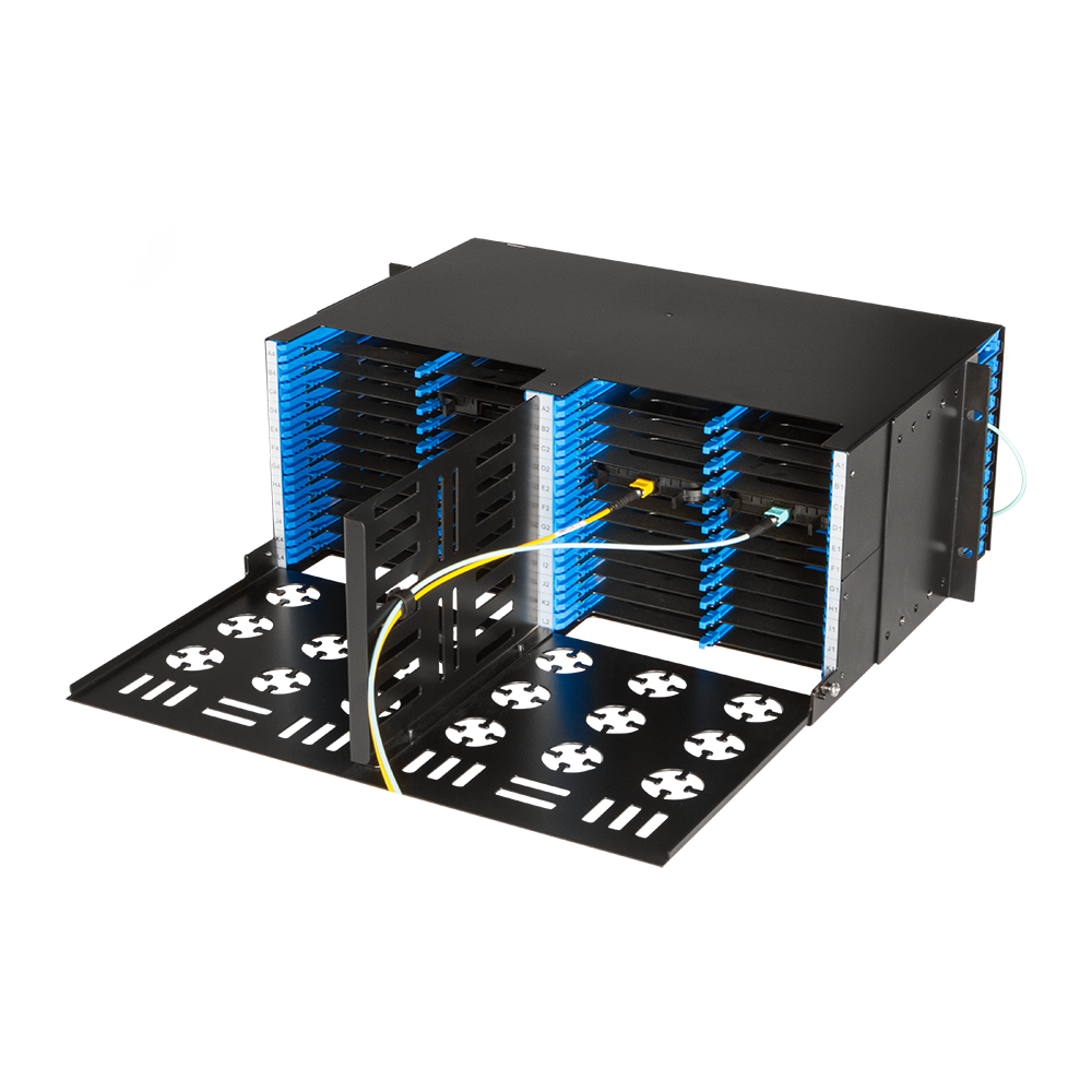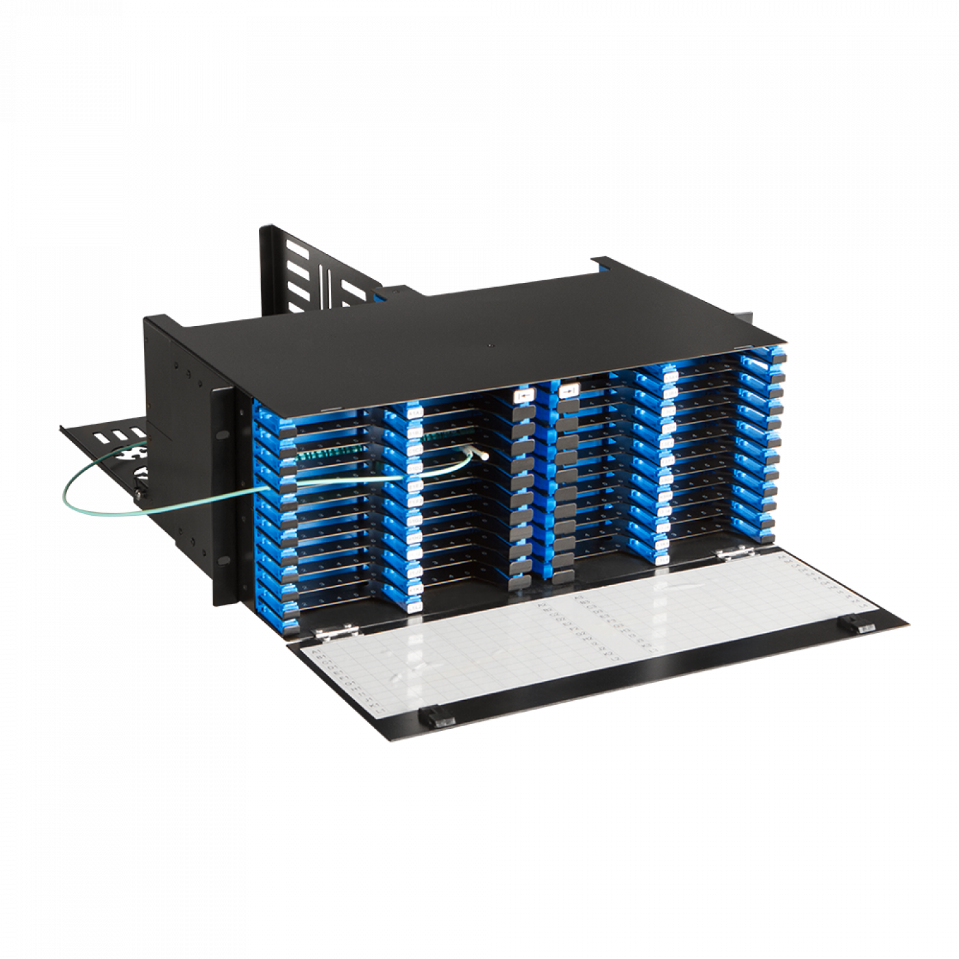 Благодаря такой конструкции а так же размеру МРО кассет, предназначенных для использования в данном кроссе, плотность размещения на 4U составляет 576 портов LC.Выдвижной механизм полок для кассет обеспечивает удобство подключения кабельной сборки сзади кассет, а так же комфортное подключение LC патч-кордов с фронтальной стороны кросса.