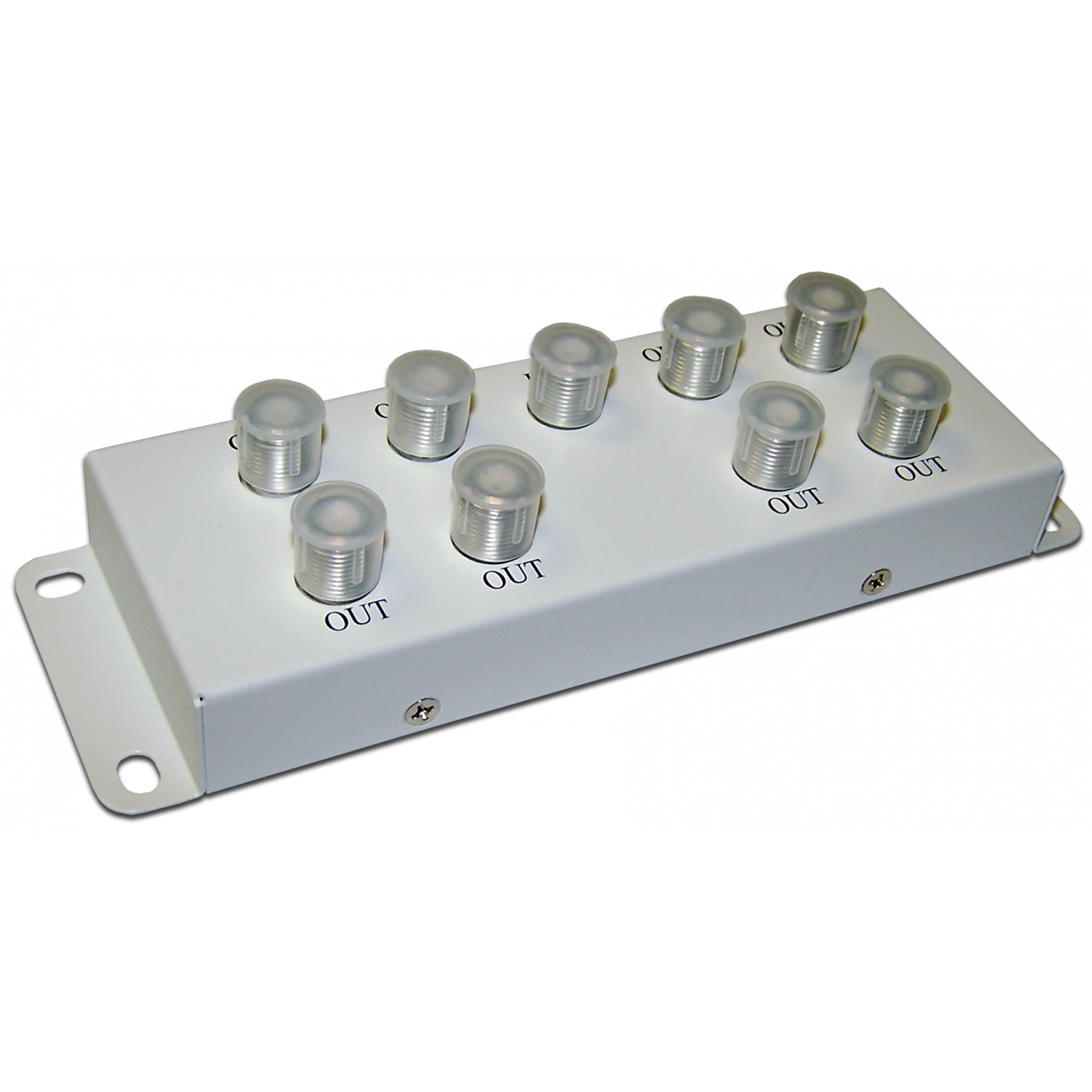 Пассивный сплиттер TV-сигнала позволяет распределить входящий высокочастотный сигнал на 8 параллельных выходов. Подключения кабелей осуществляется с помощью F-коннекторов с резьбовым соединением. Система крепления позволяет производить установку сплиттера в шкаф ДКС LANMASTER, монтажные шкафы других производителей и просто на стену. Рабочие частоты – от 5 до 2400 МГц.