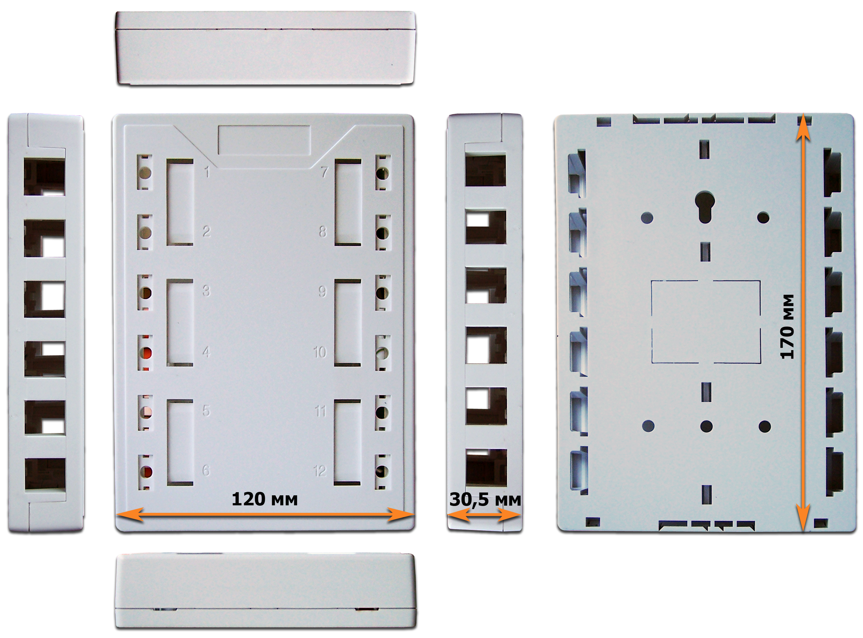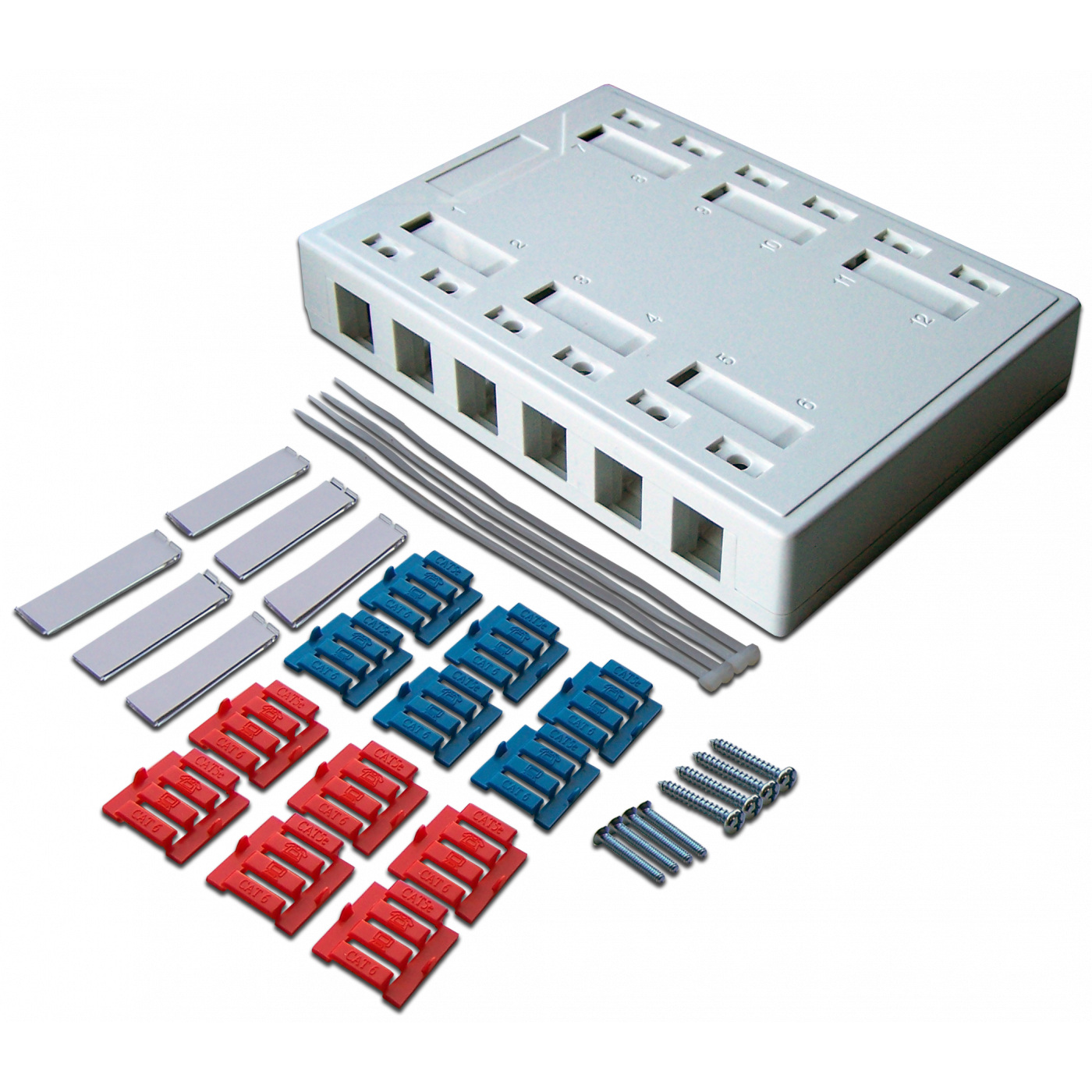 Настенная накладная коробка под установку 12-ти модулей типа Keystone может применяться для создания многопользовательской телекоммуникационной розетки, или розетки комбинированного назначения.