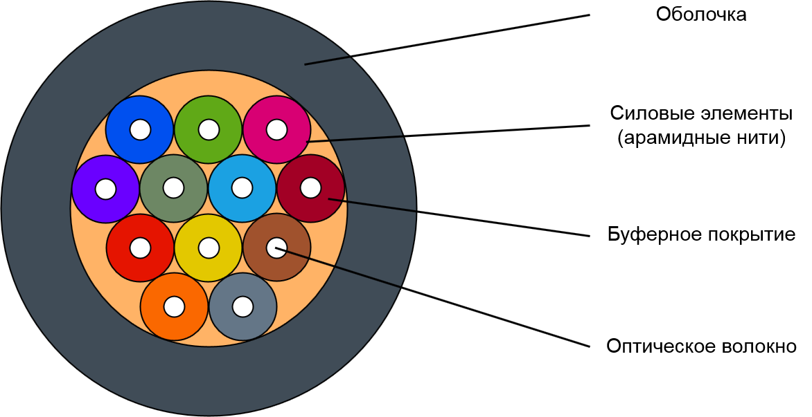 Кабель содержит пучок оптических волокон в буферном покрытии, на который наложен слой упрочняющих арамидных нитей. Оболочка кабеля изготавливается из полиэтилена.