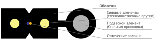 Кабель содержит свободно уложенные оптические волокна. В качестве силовых элементов используются стеклопластиковые прутки. В качестве подвесного элемента используется стальная проволока. Волокна, силовые элементы и подвесной элемент находятся в общей оболочке. Оболочка кабеля изготавливается из полимерной композиции, не распространяющей горение, не содержащей галогенов с низким дымовыделением, черного цвета, стойкой к ультрафиолетовому излучению.
