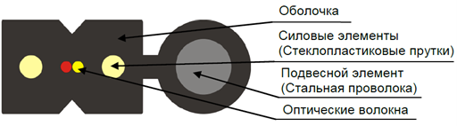 Кабель содержит свободно уложенные оптические волокна. В качестве силовых элементов используются стеклопластиковые прутки. В качестве подвесного элемента используется стальная проволока. Волокна, силовые элементы и подвесной элемент находятся в общей оболочке. Оболочка кабеля изготавливается из полимерной композиции, не распространяющей горение, не содержащей галогенов с низким дымовыделением, черного цвета, стойкой к ультрафиолетовому излучению.