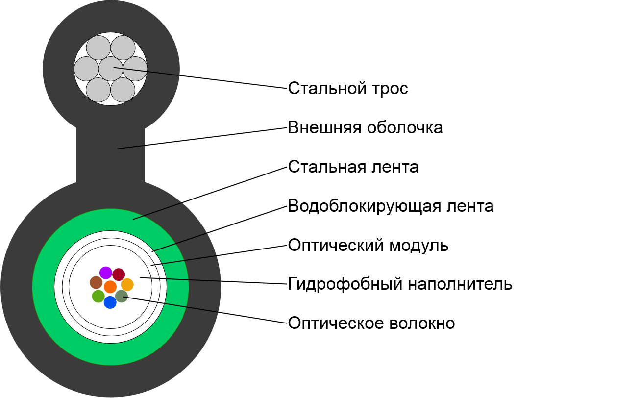Кабель содержит оптический модуль со свободно уложенными волокнами. Свободное пространство в оптическом модуле заполнено гидрофобным наполнителем. На оптический модуль накладывается водоблокирующая и стальная лента. В качестве подвесного элемента используется стальной трос. На оптический модуль и подвесной элемент накладывается оболочка из полиэтилена средней плотности.