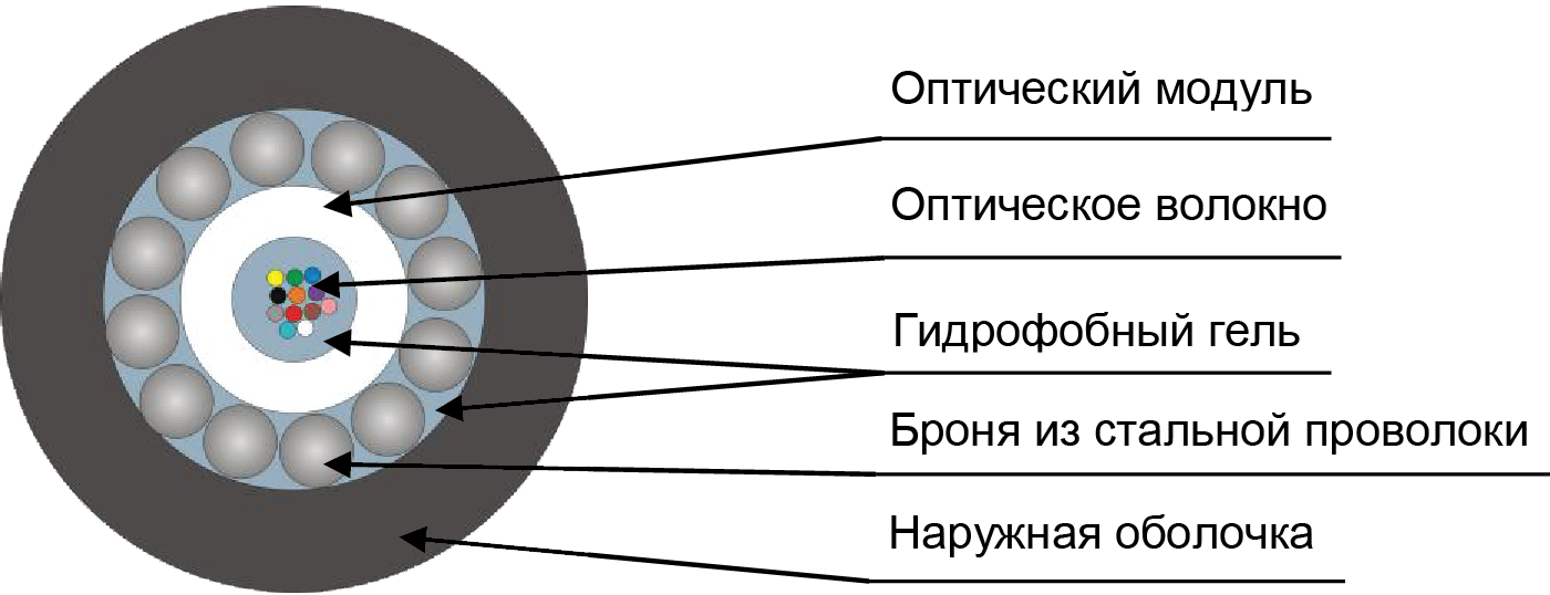 Кабель содержит центральный оптический модуль со свободно уложенными волокнами. Свободное пространство в оптическом модуле заполнено гидрофобным гелем. На центральный оптический модуль спирально накладывается броня из стальных проволок. Свободное пространство между проволоками заполнено гидрофобным гелем. На броню накладывается оболочка из полимерной композиции, не распространяющей горение, не содержащей галогенов с низким дымовыделением, стойкой к УФ-излучению.