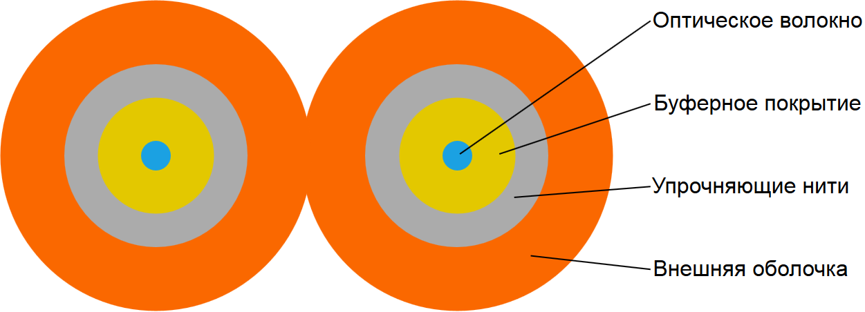 Кабель состоит из двух оптических волокон в плотном буфере 900 мкм, в окружении арамидных нитей, каждое волокно находится внутри отдельной оболочки.