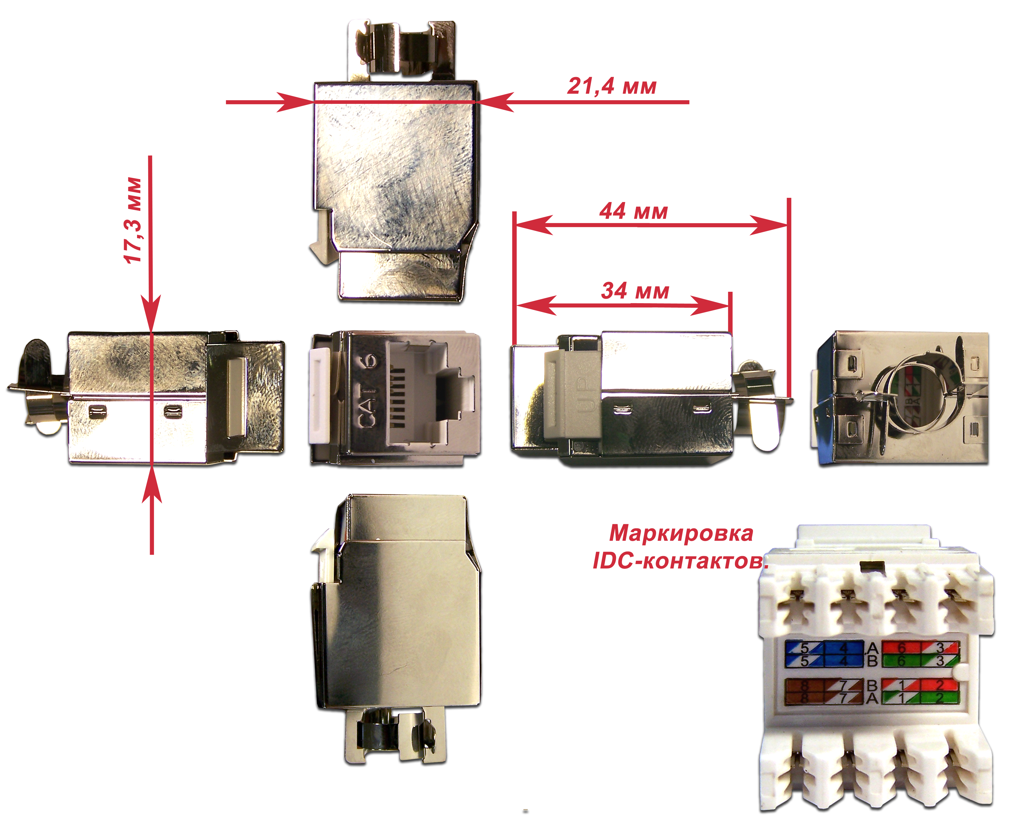 Для удобства монтажа, между IDC разъемами модуля расположена схема подключения проводников кабеля, в соответствии со схемами T568A и T568B.