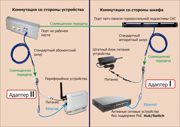 Адаптер (I), с гнездом для подачи питания, подключается в патч-панель разъемом RJ-45. В гнездо подачи питания подключается разъем блока питания. В гнездо RJ-45 подключается информационная линия с активного сетевого устройства (Hub или Switch) при помощи стандартного патч-корда соответствующей категории и нужной длины.