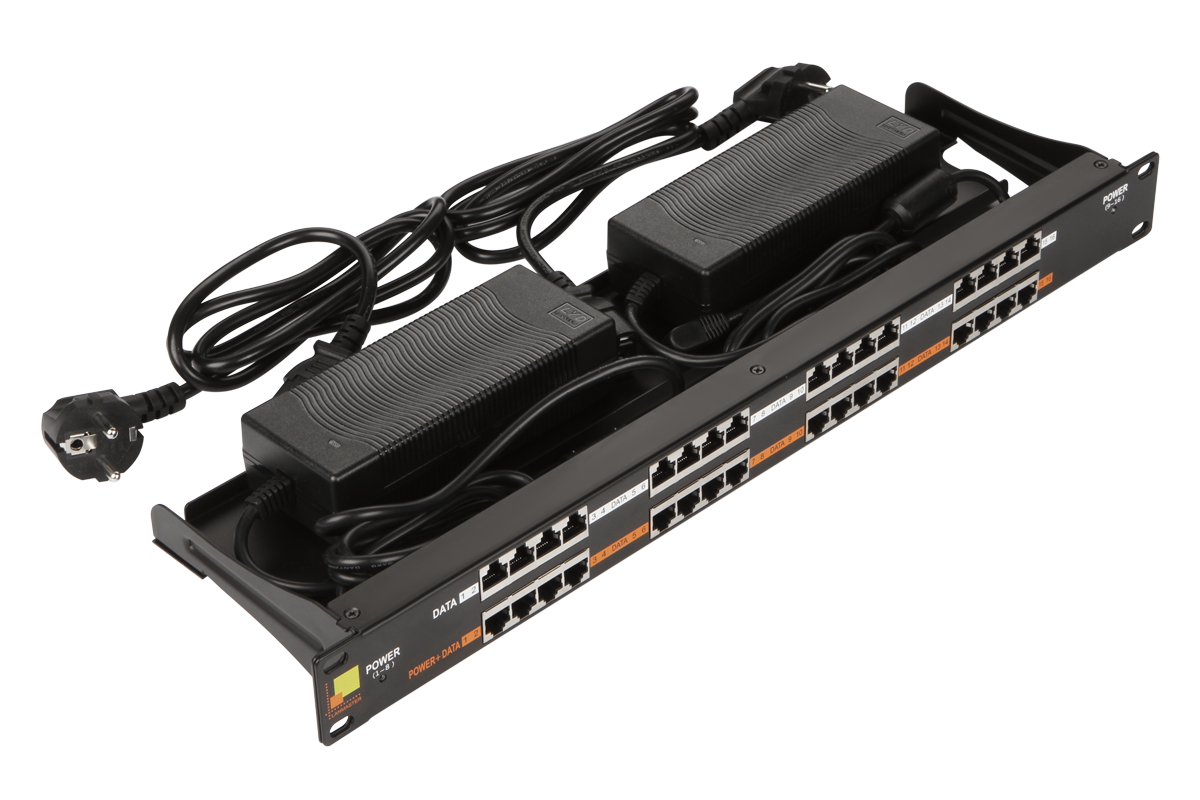 Смешанный сигнал (Power+Data) выходит со второго ряда гнезд (обозначенных желтой полосой). Он может быть скоммутирован на панели горизонтальной или магистральной подсистемы СКС.