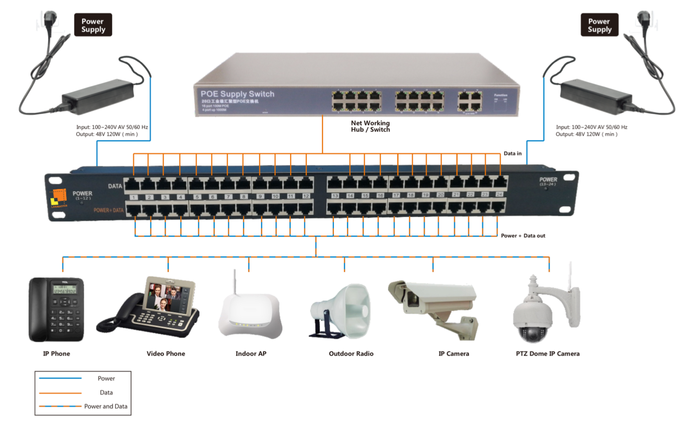 Схема подключения заключается в том, что на верхний ряд (Data) разъемов RJ-45 (обозначенных белой полосой) коммутируются порты сетевого активного устройства не поддерживающего стандарт PoE.