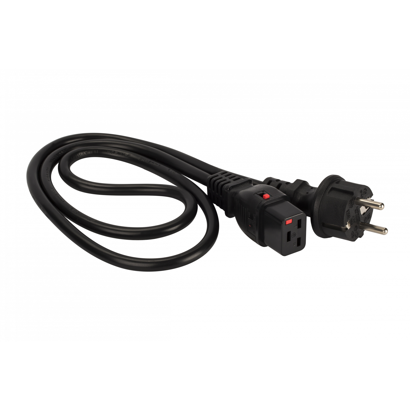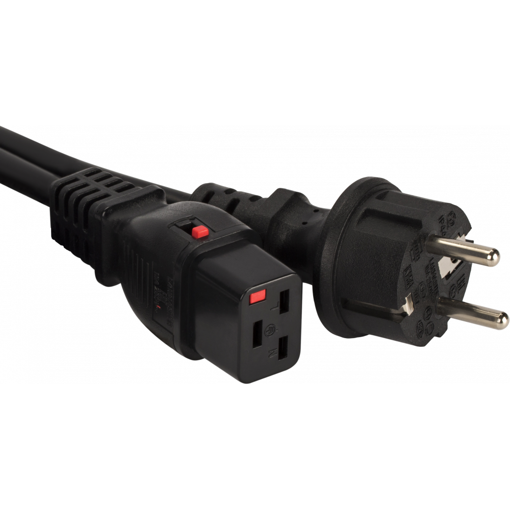 Особенностью этого шнура питания является то, что штекер С19 оснащен механизмом защиты от случайного или преднамеренного отключения от сети.