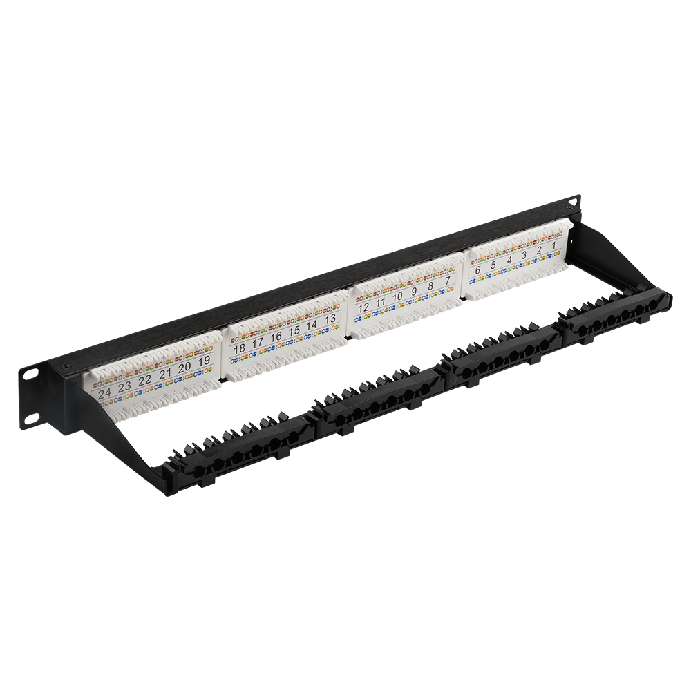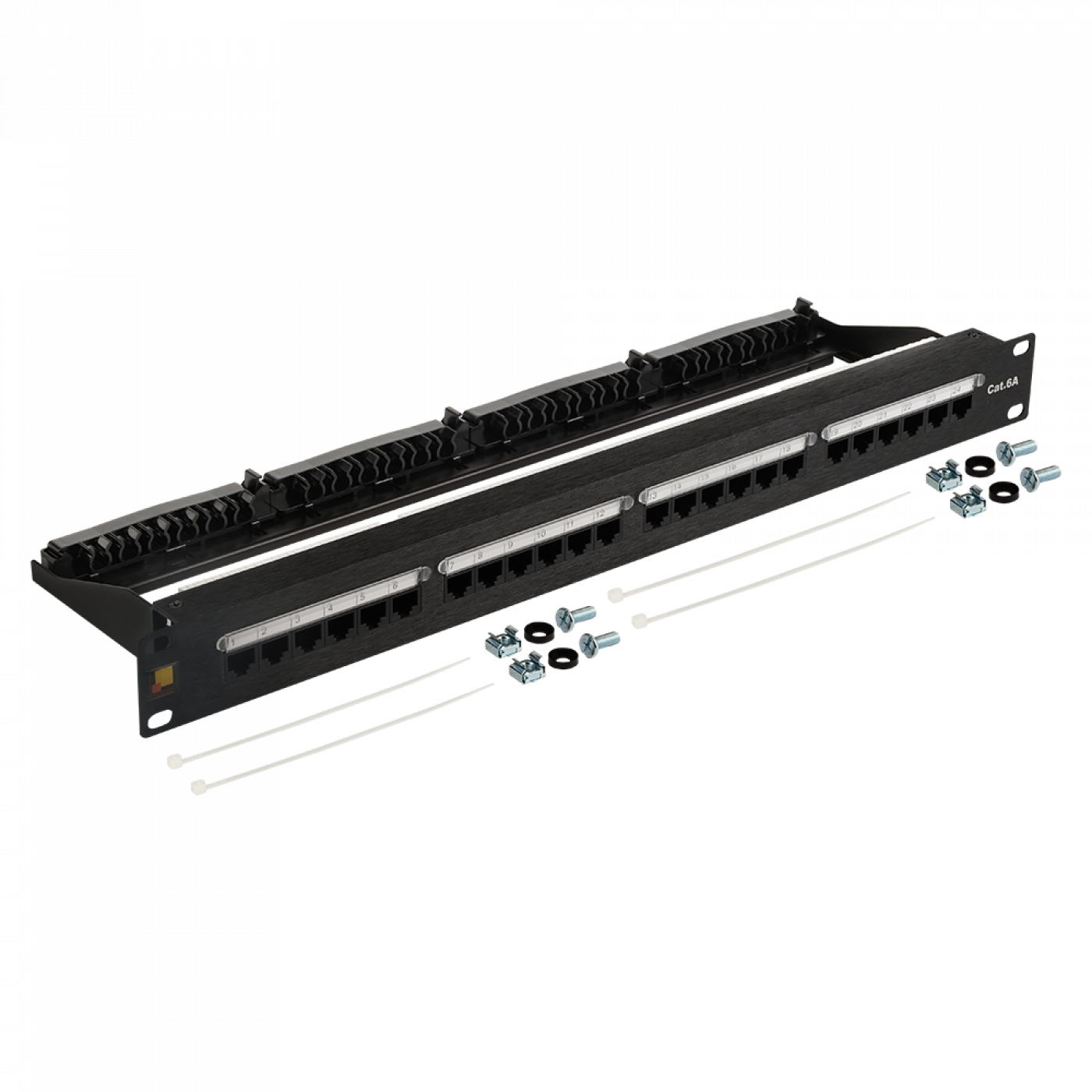 Патч-панель 19", 24 порта RJ45, неэкранированная, кат.6A, 1U, с задним органайзером с фиксаторами кабеля