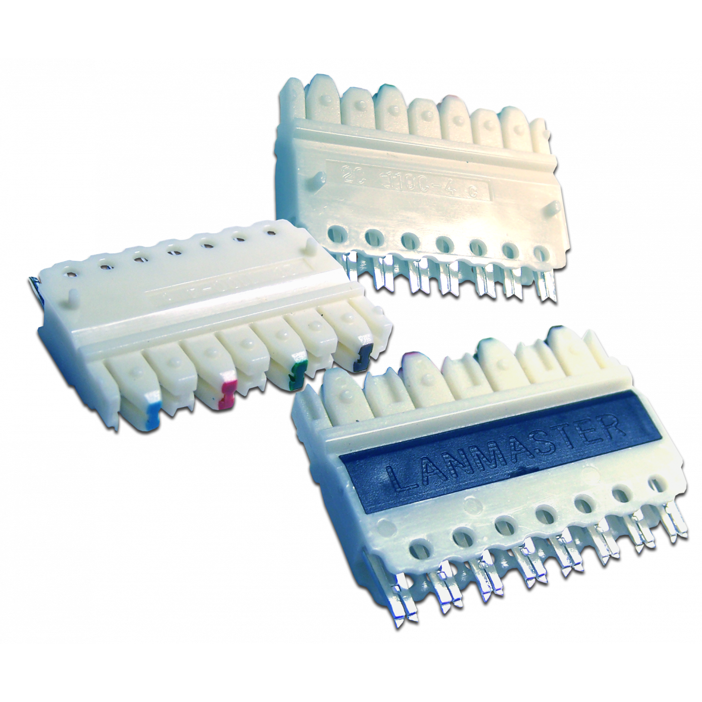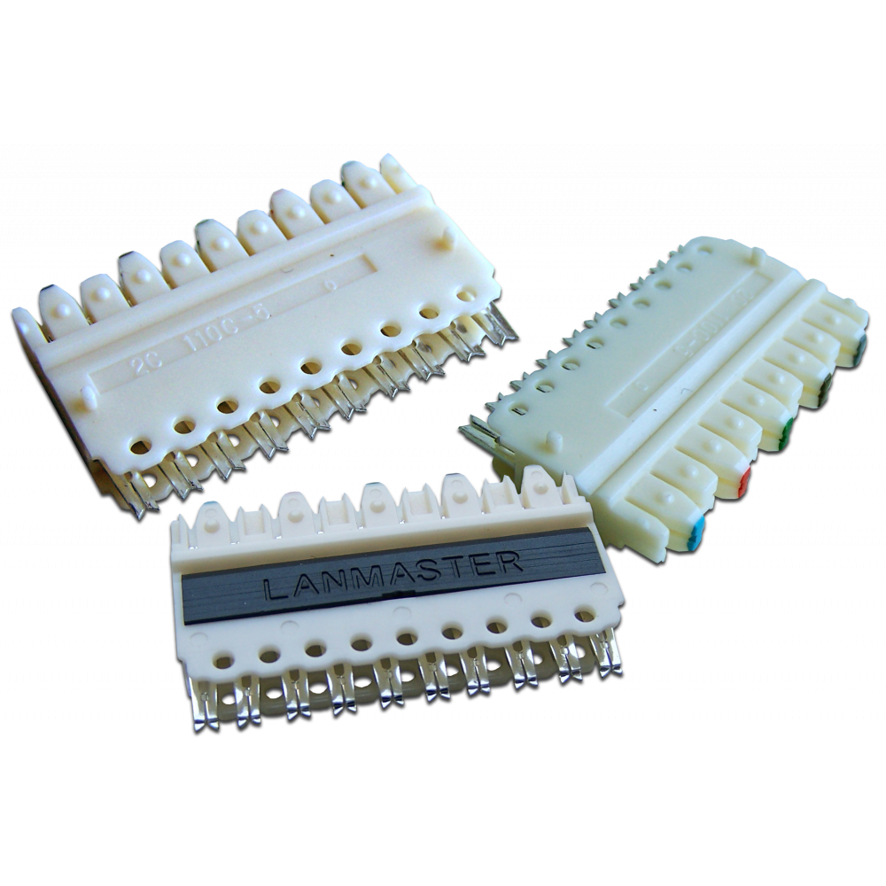 Со стороны блока, обращенной к кроссу, они имеют IDC-контакты, лезвия которых, с помощью ударного инструмента, врезаются в проводники кабеля и обеспечивают надежный контакт. При этом блок закрепляется на контактной полосе кросса.С другой стороны блока расположены разъемы 110 типа для подключения коммутационных шнуров или перемычек.Для маркировки пар на разъеме нанесены цветные метки: синяя, оранжевая, зеленая, коричневая.