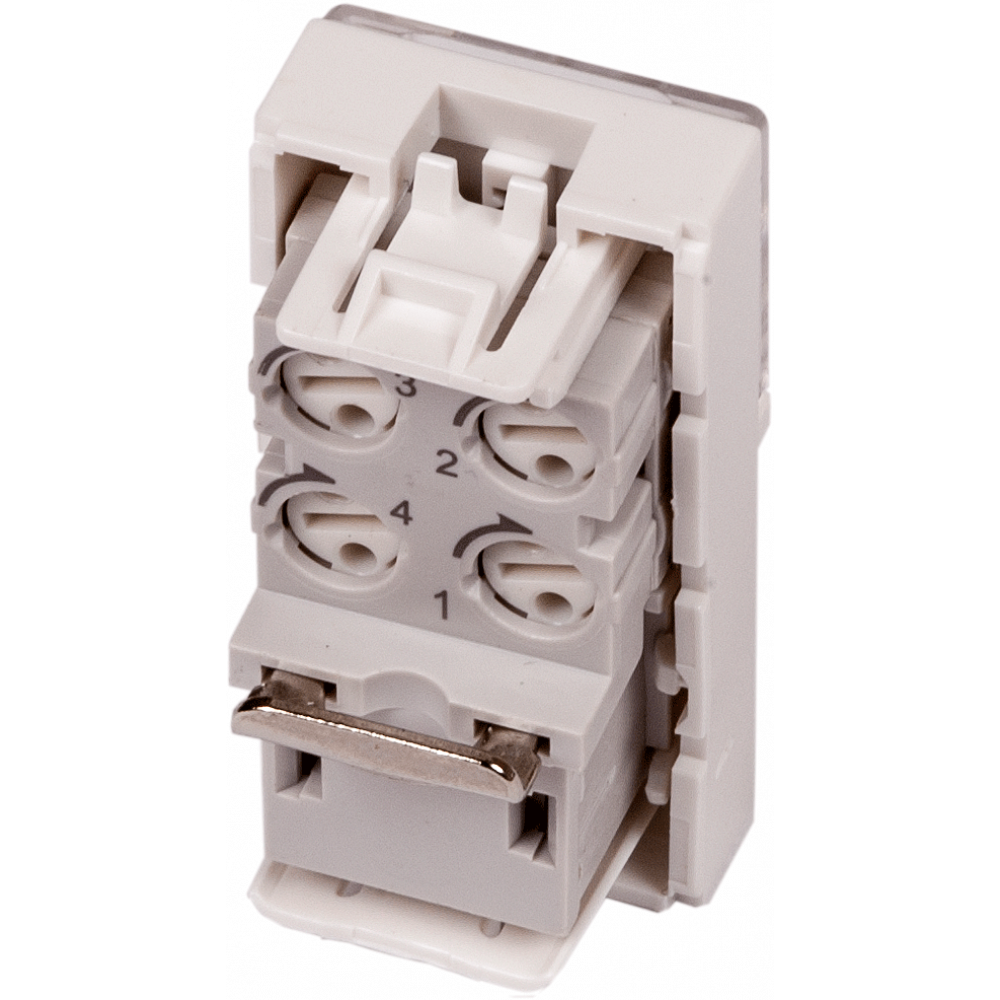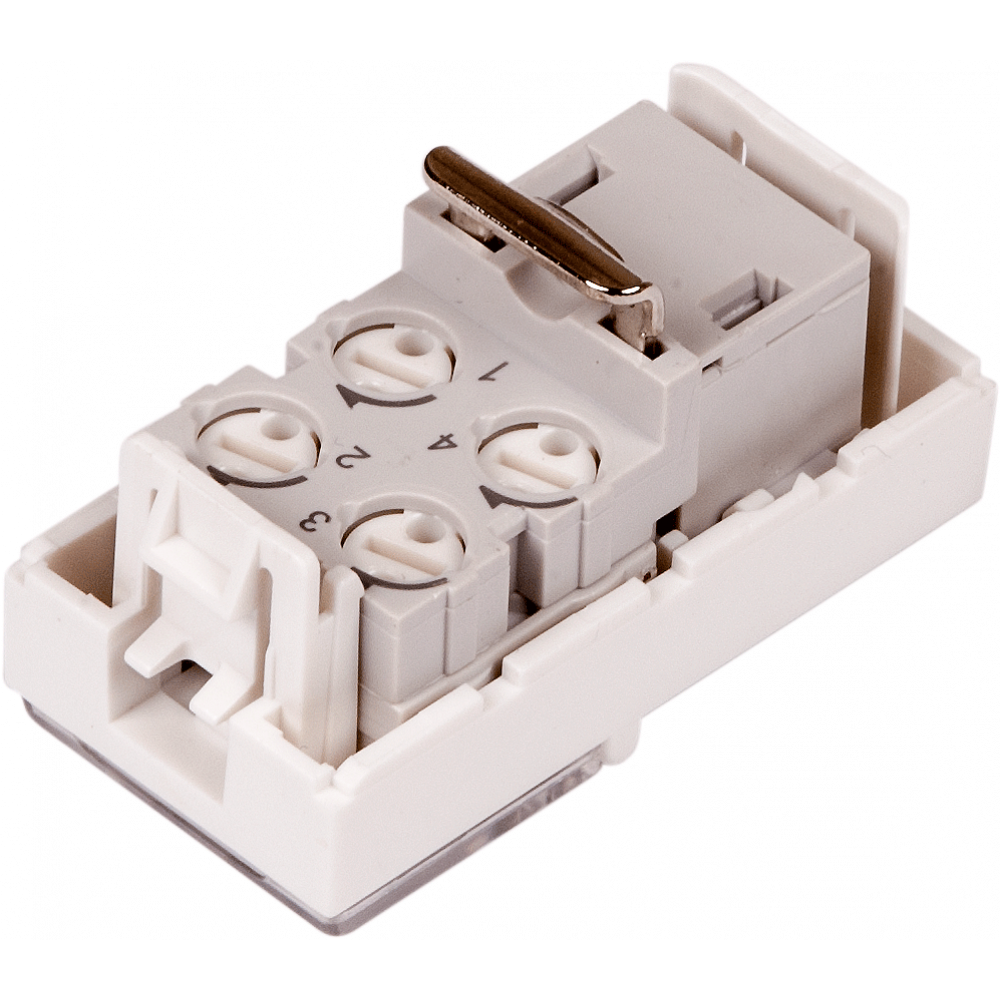 Однопортовые телекоммуникационные вставки стандарта Mosaic предназначены для разделки в них информационных и телефонных кабелей. На задней стороне модуля расположены контакты для подключения проводников кабеля. С лицевой стороны вставки контакты информационного порта прикрыты сдвижной шторкой. Вставка имеет увеличенное поле маркировки, прикрытое прозрачной крышкой.