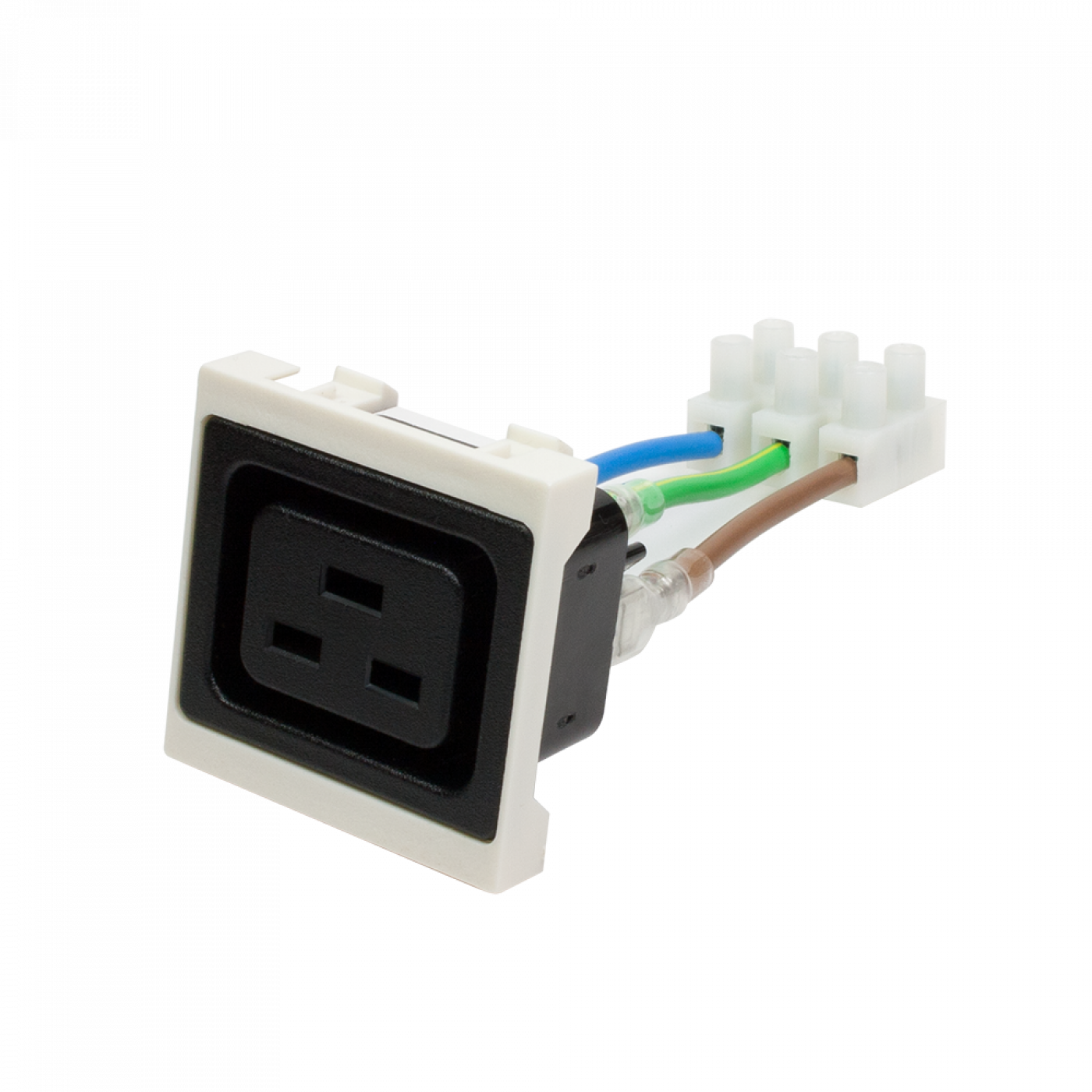 Вставки предназначены для организации точки подключения электрических приборов, оборудованных шнуром питания с вилкой C20. Модуль имеет размер 45х45 мм под французский стандарт Mosaic и может применяться для комплектации розеток, а также рабочих мест в миниколоннах, напольных лючках и настенных боксах.