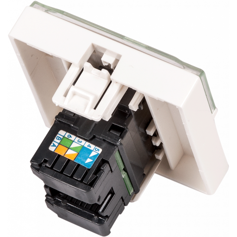 Однопортовые телекоммуникационные вставки стандарта Mosaic предназначены для разделки в них информационных и телефонных кабелей. На задней стороне модуля расположены контакты для подключения проводников кабеля. С лицевой стороны вставки контакты информационного порта прикрыты сдвижной шторкой. Вставка имеет увеличенное поле маркировки прикрытое прозрачной крышкой.