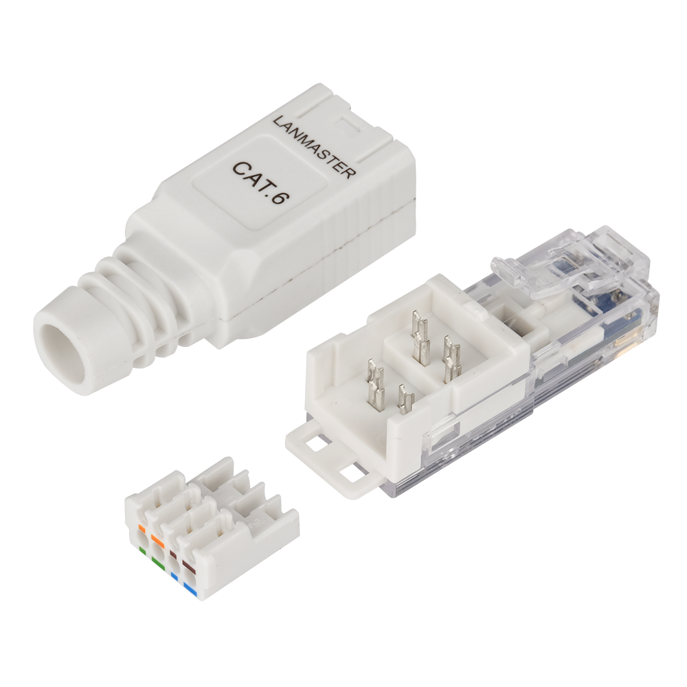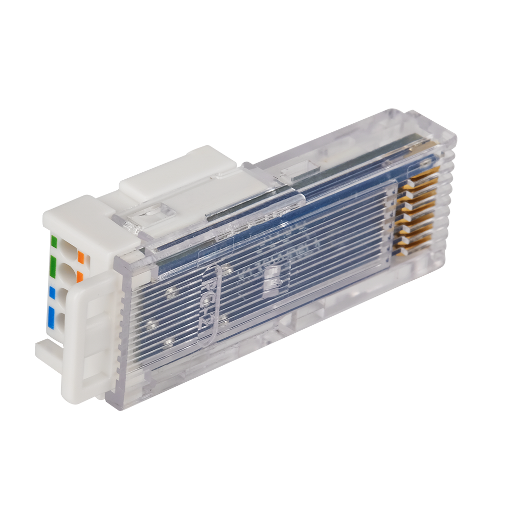 Коннектор RJ-45 предназначен для оконцевания неэкранированного кабеля витая пара в полевых условиях. Разъем может быть полезным при необходимости подключения оборудования напрямую, без установки розетки RJ-45.
