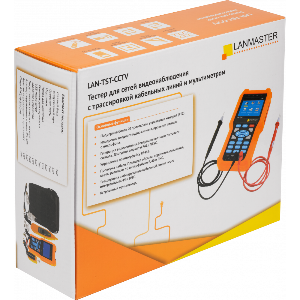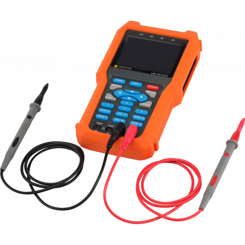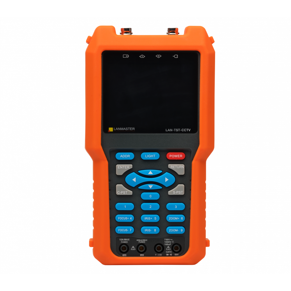 Многофункциональный тестер систем видеонаблюдения (LAN-TST-CCTV) предназначен для монтажа и обслуживания систем видео мониторинга. Прибор может использоваться для просмотра видео сигнала с камер наблюдения, управления камерой по трем координатам (PTZ), генерации изображений, захвата данных через интерфейс RS485, тестирования кабелей LAN.