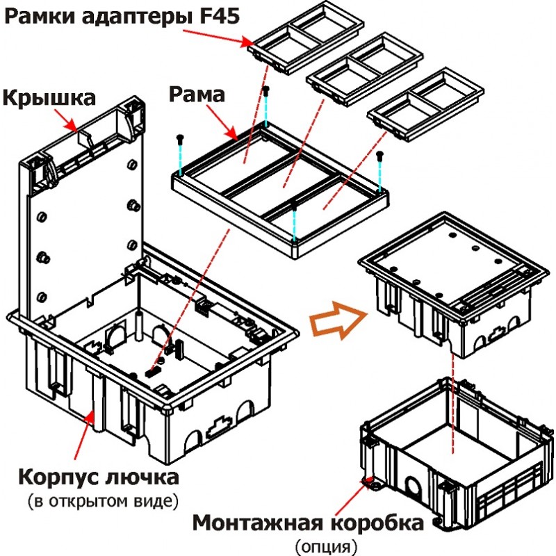 Лючок может устанавливаться в фальшпол, а также в заливной пол при использовании дополнительной монтажной коробки.
