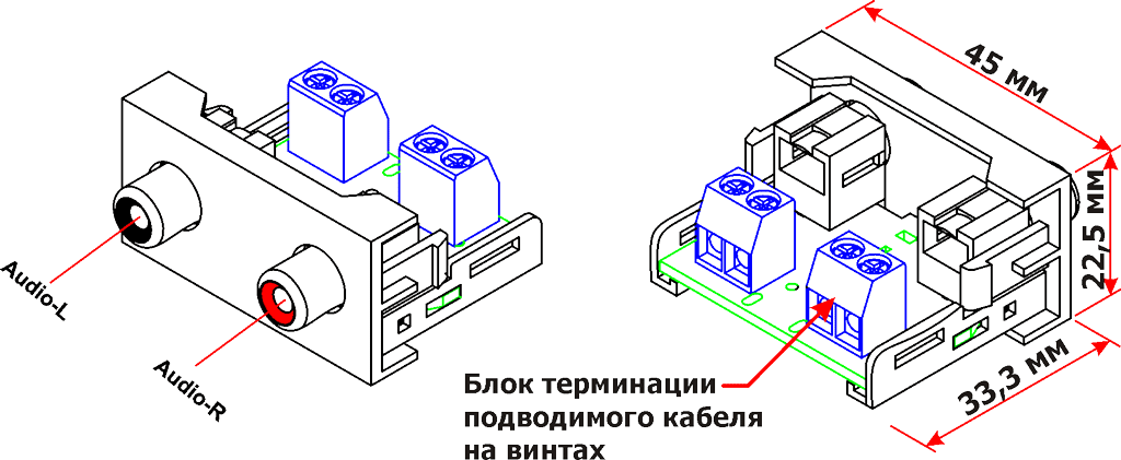 С лицевой стороны панель оснащена разъемами RCA «тюльпан» для подключения коннекторов. Стандартные цвета корпусов разъёмов: белый — для монофонического сигнала или левого канала стереофонического двухканального аудиосигнала, красный — для правого канала стереофонического двухканального аудиосигнала. Фиксация кабеля с тыльной стороны панели осуществляется при помощи блока винтовой терминации, согласно приложенной схеме распределения сигналов.