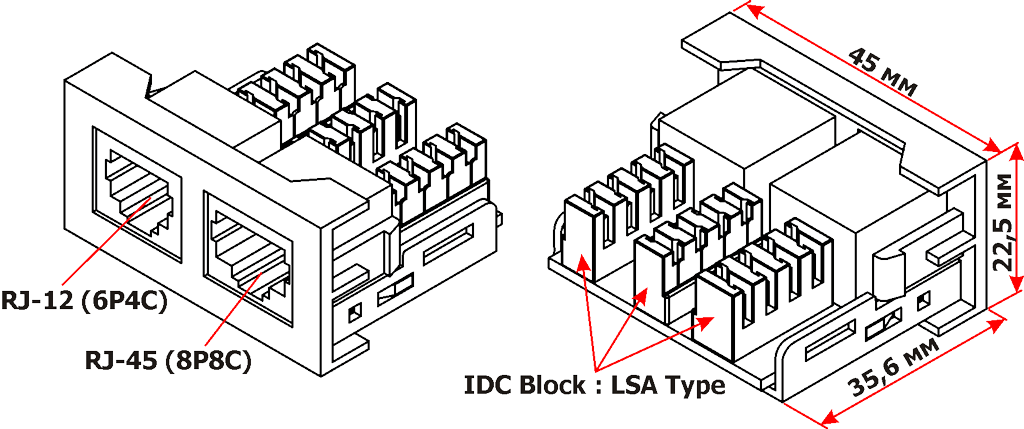 Лицевая панель с встроенными модулями категории 5e UTP RJ-45 (8P8C) и RJ-12 (6P4C) предназначена для организации двухпортового рабочего места неэкранированных слаботочных сетей.