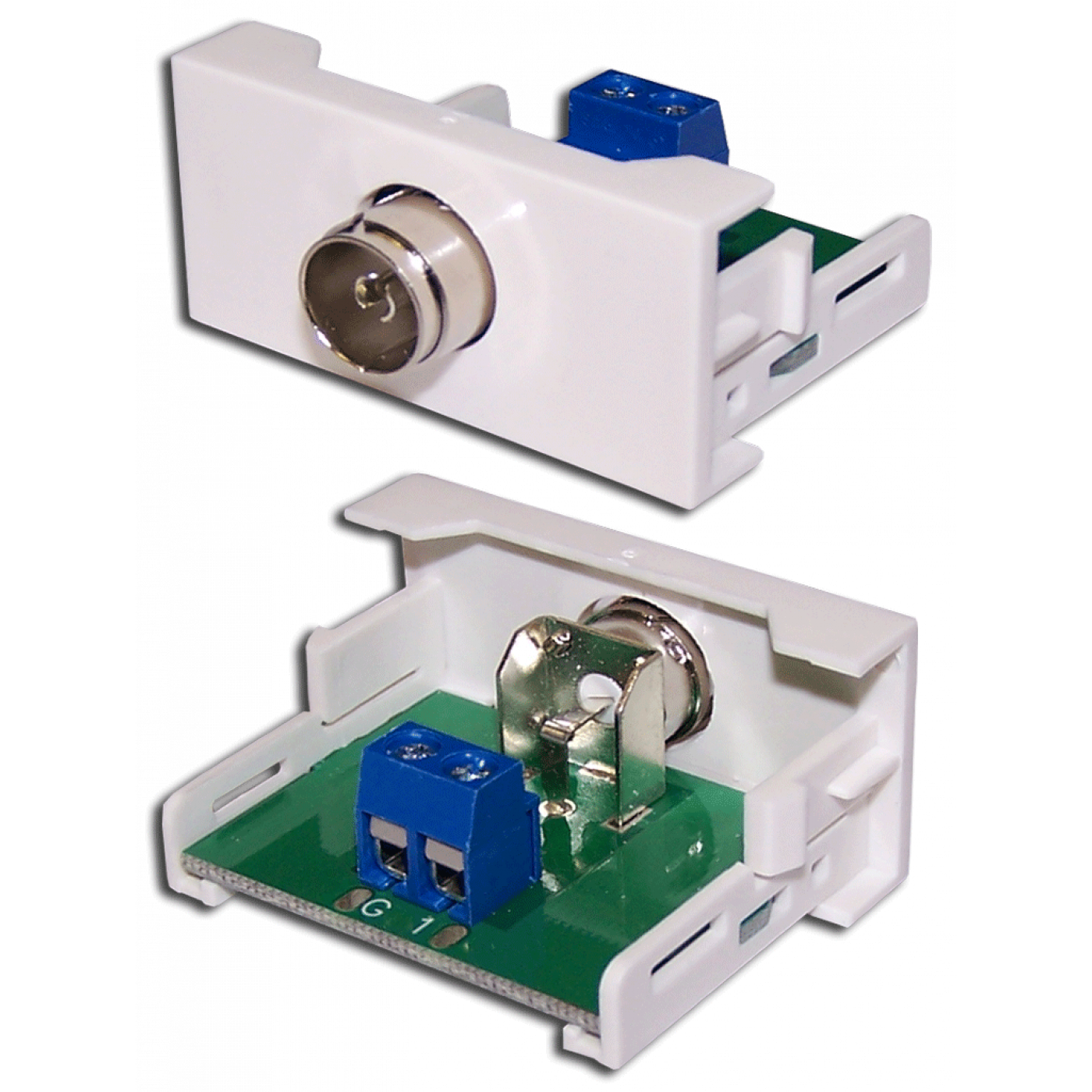 С лицевой стороны модуль оснащен гнездом PAL female. Фиксация жил кабеля с тыльной стороны осуществляется в винтовом блоке. Стандартный линейный коаксиальный разъем TV / PAL используется для подключения кабелей для ТВ, видео, антенного усилителя, сети CATV и т.д.