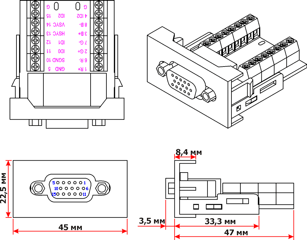 С лицевой стороны модуль оснащен разъемом D-SUB (HDB-15). Фиксация кабеля с тыльной стороны панели осуществляется на винтовых блоках.