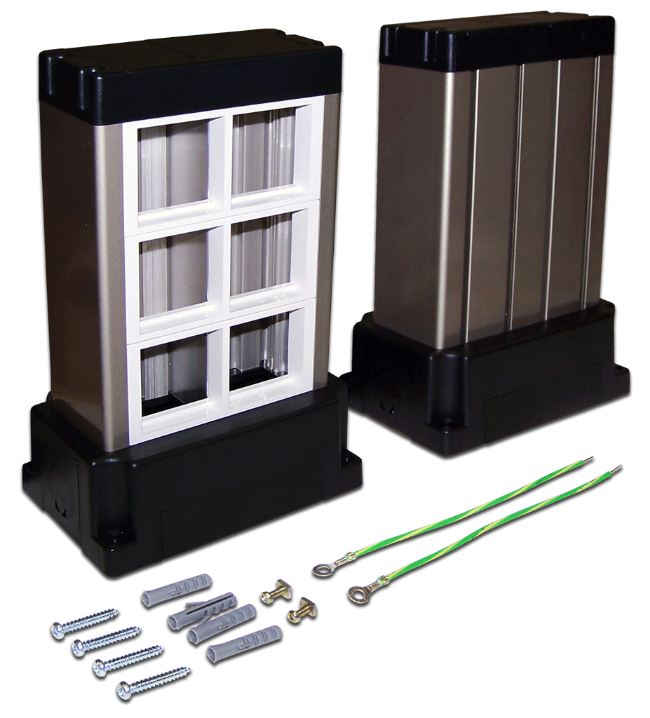 Миниколонна имеет 6 посадочных мест под французский стандарт Mosaic 45x45 в лицевых панелях ( по 2 места в каждой панели).