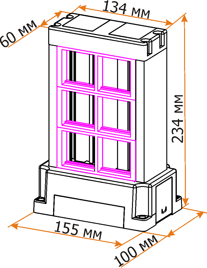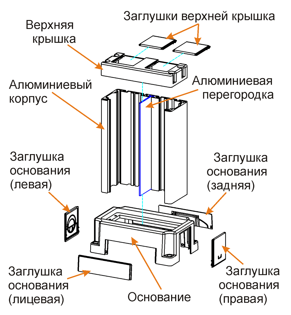 Внутри корпуса установлена съемная алюминиевая перегородка. Корпус башенки устанавливается на пластиковое основание, фиксируемое к полу на четыре дюбеля с саморезами. При необходимости дюбеля могут быть с легкостью заменены на анкера с резьбой не более М6. Верхняя часть корпуса имеет пластиковую крышку с двумя съемными заглушками.