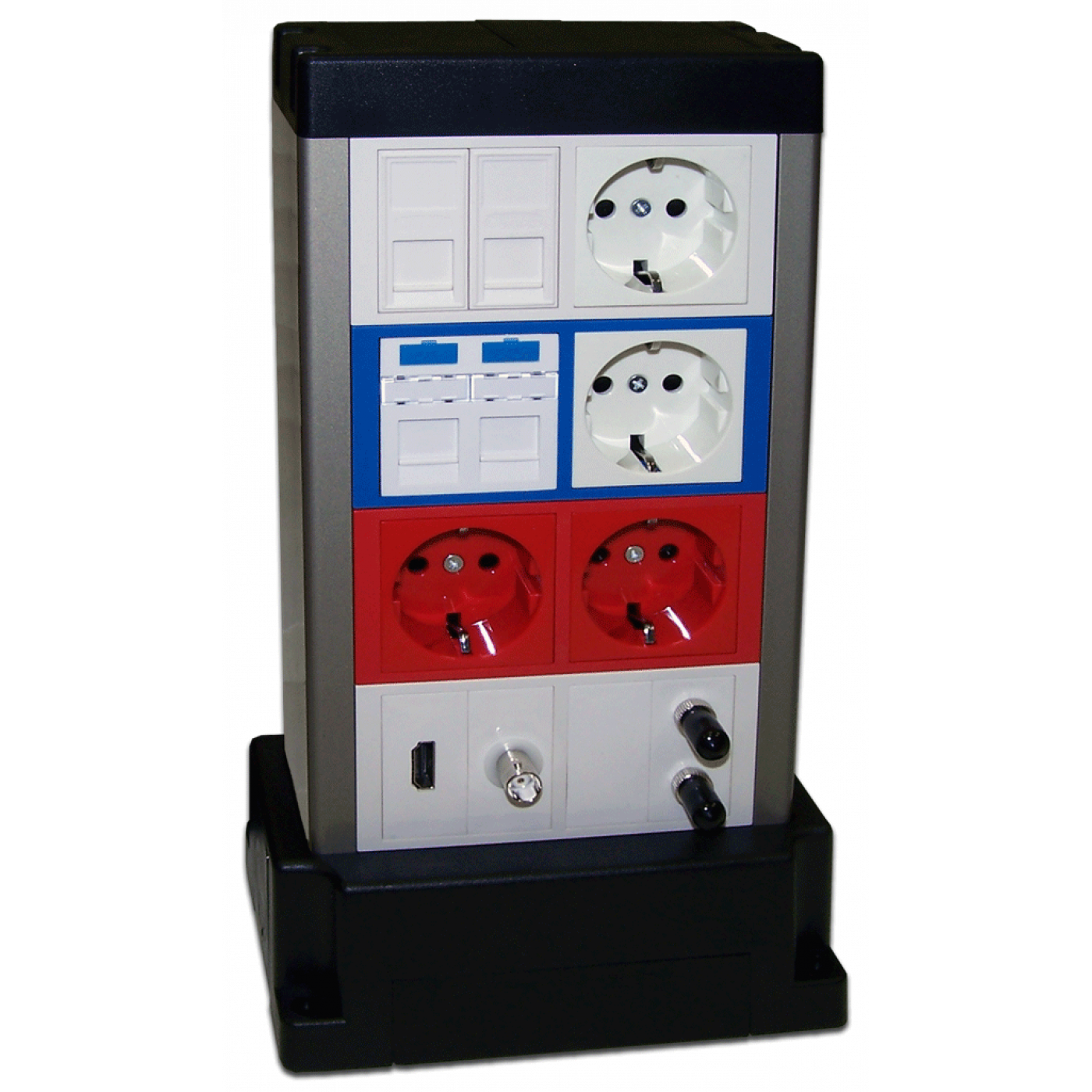 В базовой комплектации имеются четыре лицевые панели белого цвета для вертикально ориентированных модулей. При необходимости панели адаптеров могут меняться на платы других цветов (красные или синие), а также на панели с горизонтальной ориентацией устанавливаемых механизмов. Благодаря модульному принципу комплектации миниколонны, можно создавать различные сценарии комбинирования силовых, телекоммуникационных, мультимедийных розеток.
