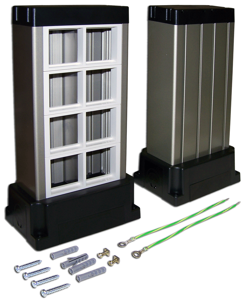 Миниколонна имеет 8 посадочных мест под французский стандарт Mosaic 45x45 в лицевых панелях ( по 2 места в каждой панели).