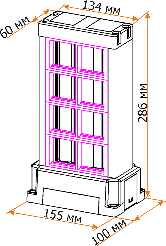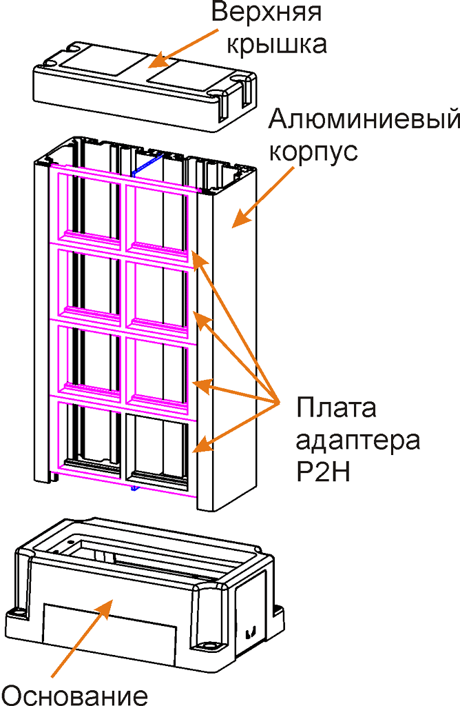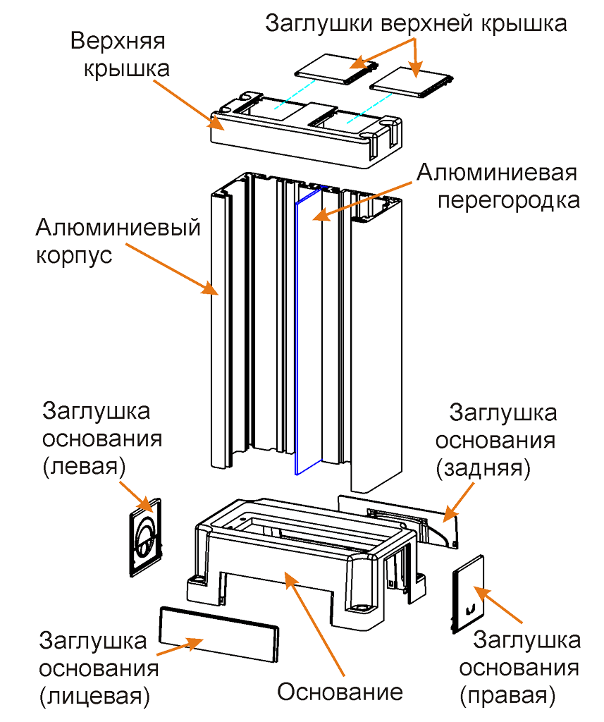 Внутри корпуса установлена съемная алюминиевая перегородка. Корпус башенки устанавливается на пластиковое основание, фиксируемое к полу на четыре дюбеля с саморезами. При необходимости дюбеля могут быть с легкостью заменены на анкера с резьбой не более М6. Верхняя часть корпуса имеет пластиковую крышку с двумя съемными заглушками.