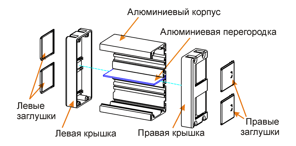 Внутри корпуса установлена съемная алюминиевая перегородка.