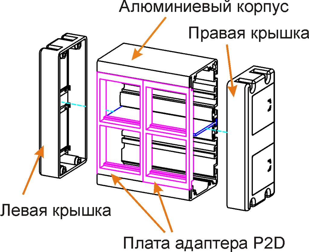 Бокс в базовой комплектации имеет две лицевых панели белого цвета для горизонтально ориентированных модулей. При необходимости панели адаптеров могут меняться на платы других цветов (красные или синие), а также на панели с вертикальной ориентацией устанавливаемых механизмов.
