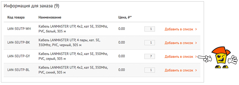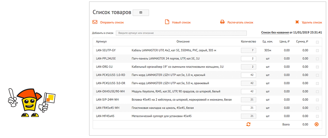 Если вы выберете пункт "Отправить список", то спецификация поступит к нам. Компания LANMASTER не осуществляет прямых продаж. Поэтому мы направим вашу спецификацию Одному из партнеров или дистрибуторов LANMASTER, исходя из специфики запроса и вашего региона.