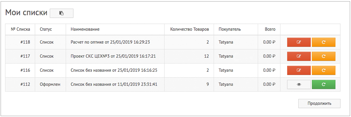 Можно создавать любое количество списков, присваивать каждому из них свое название. Это удобно, когда вы прорабатываете большое количество различных спецификаций. Нужный список можно распечатать на принтере с сайта, или сохранить в PDF формате на свой компьютер.