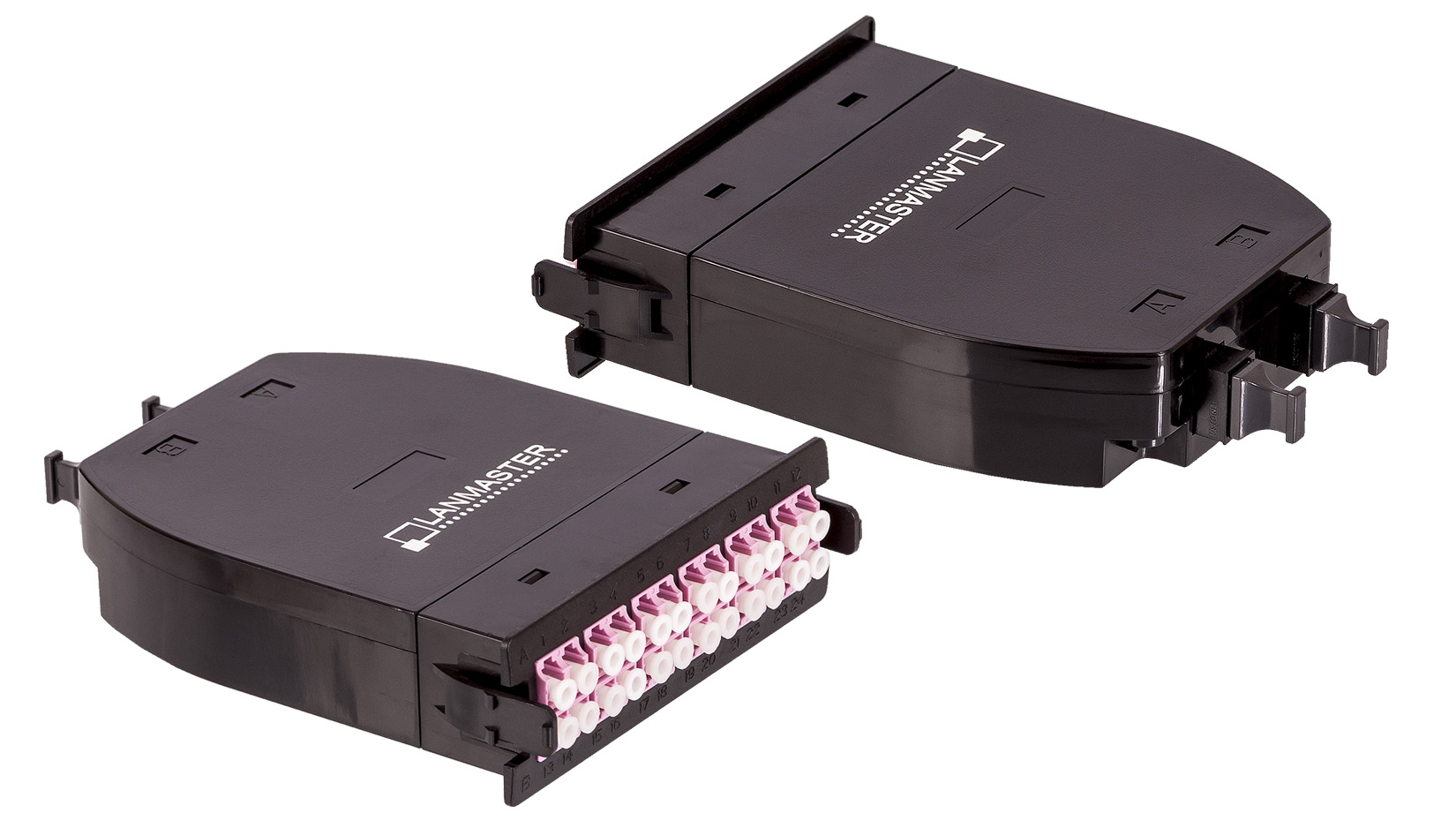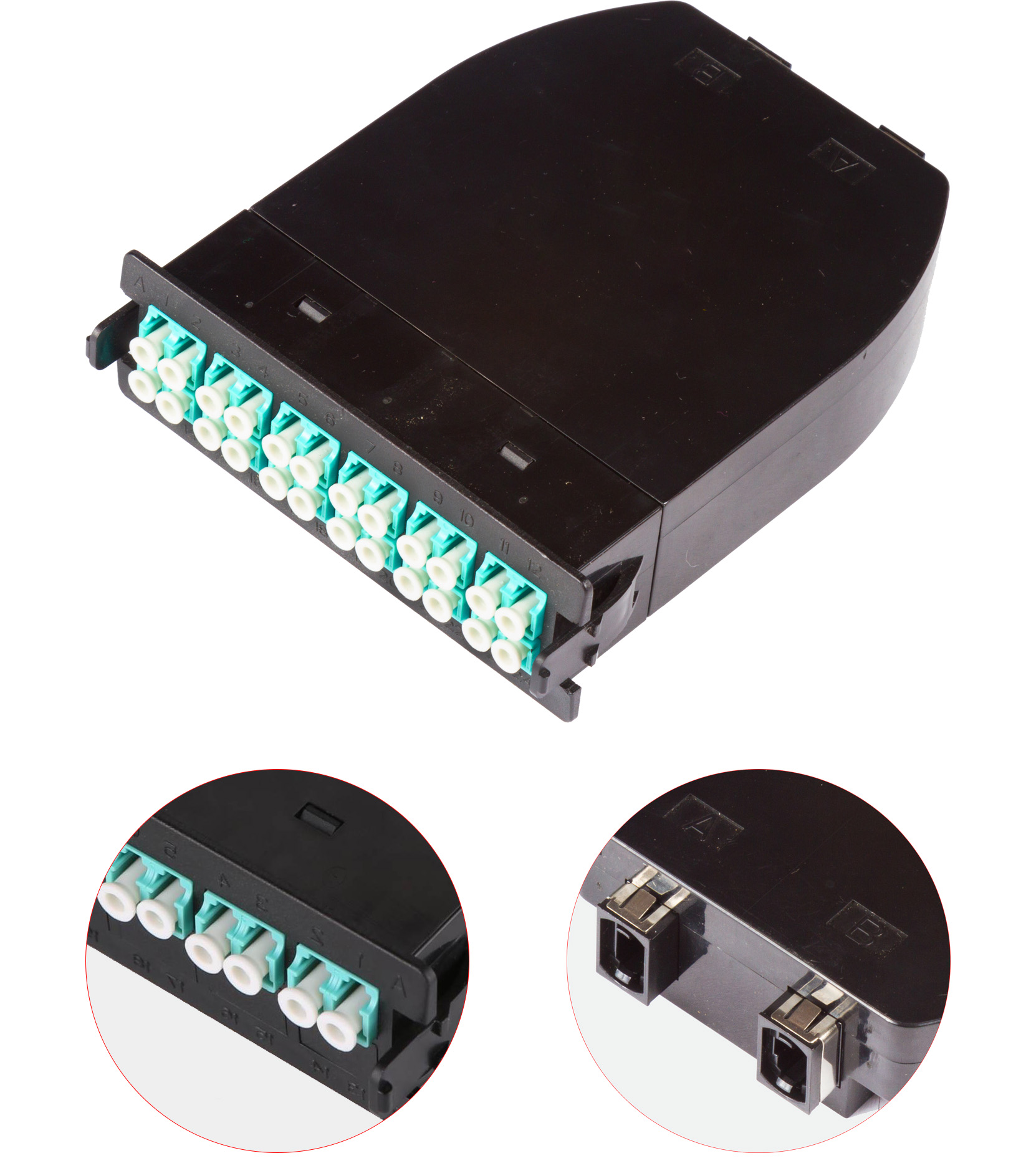 Кассета представляет собой модуль, в котором используются одна или две 12-волоконные сборки. С тыльной стороны находится 12-волоконный соединитель MPO, а с лицевой части кассеты - дискретные оптические соединители типа LC. Эти компоненты собраны в пластиковом корпусе. По бокам оснащены фиксаторами для установки в 19’’ оптическую полку