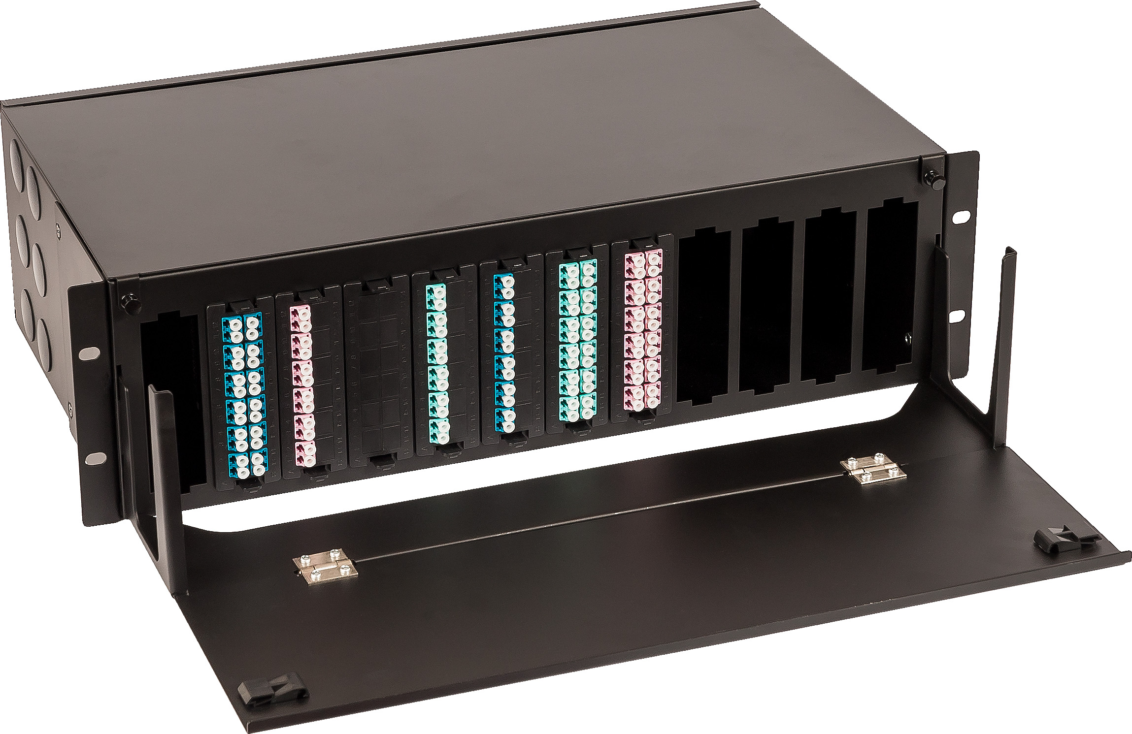 Для размещения кассет в 19'' конструктиве нужно используются специальные оптические полки. Кассеты можно установить горизонтально в панели высотой в 1U (вмещается 4 кассеты). Так же кассеты могут устанавливаться вертикально, в оптические панели высотой 3U, вместимостью 12 кассет.