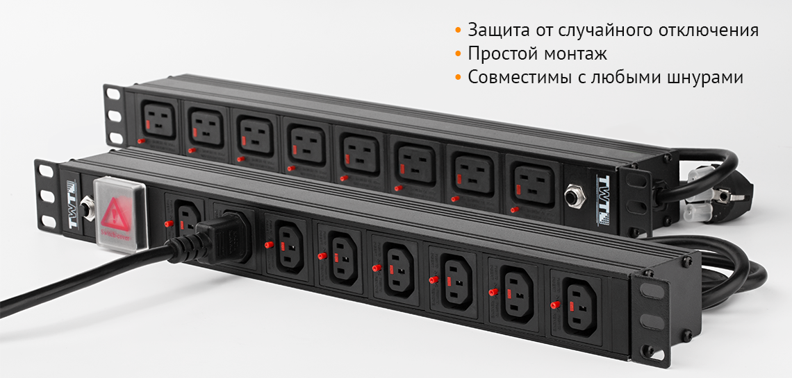 Физическая защитаБлоки распределения питания имеют механические фиксаторы, препятствующие случайному отключению кабеля питания. Применение панельных разъемов С13 и С19 с блокировкой повышает надежность подключения оборудования.