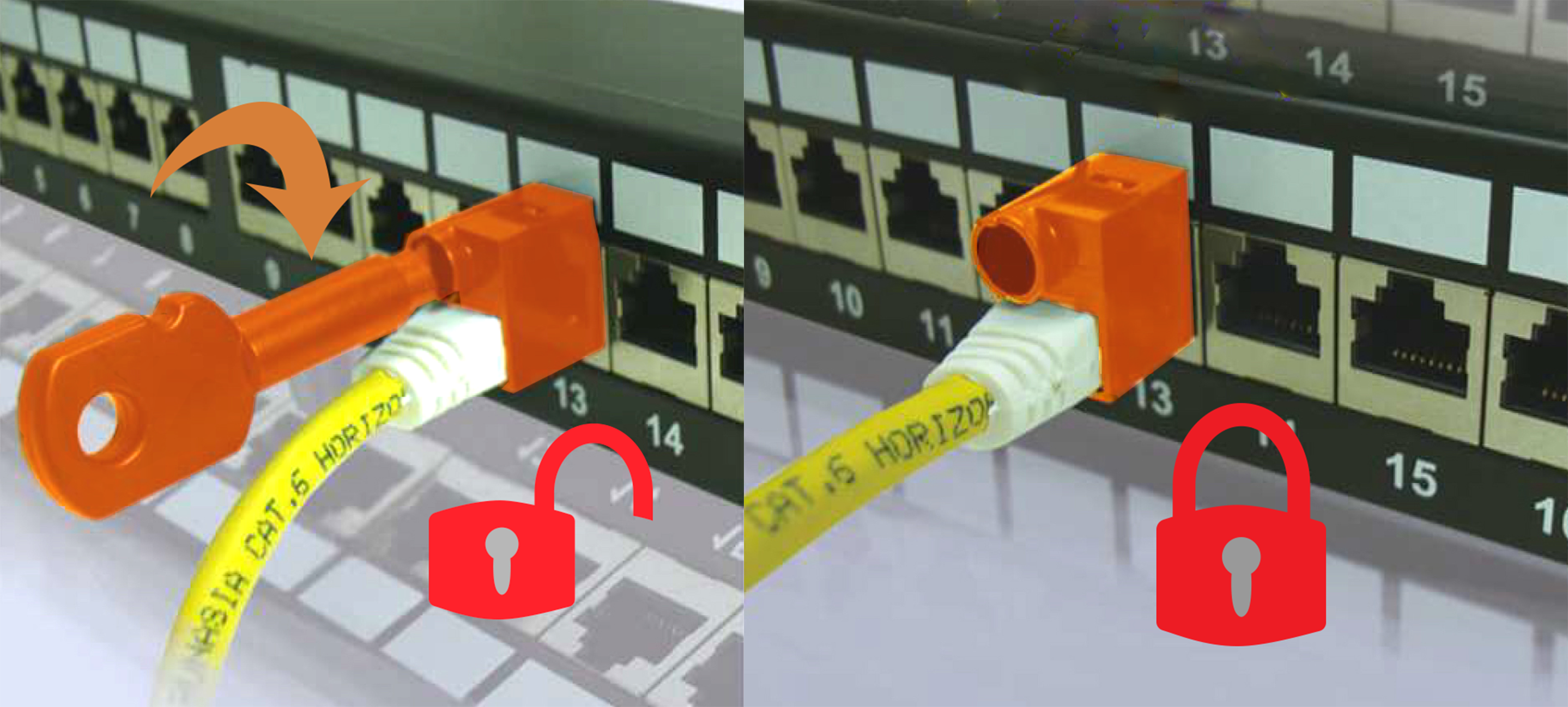 Установка и снятие блокираторов с коннектором RJ45 осуществляется при помощи специального ключа, который идет в комплекте поставки.