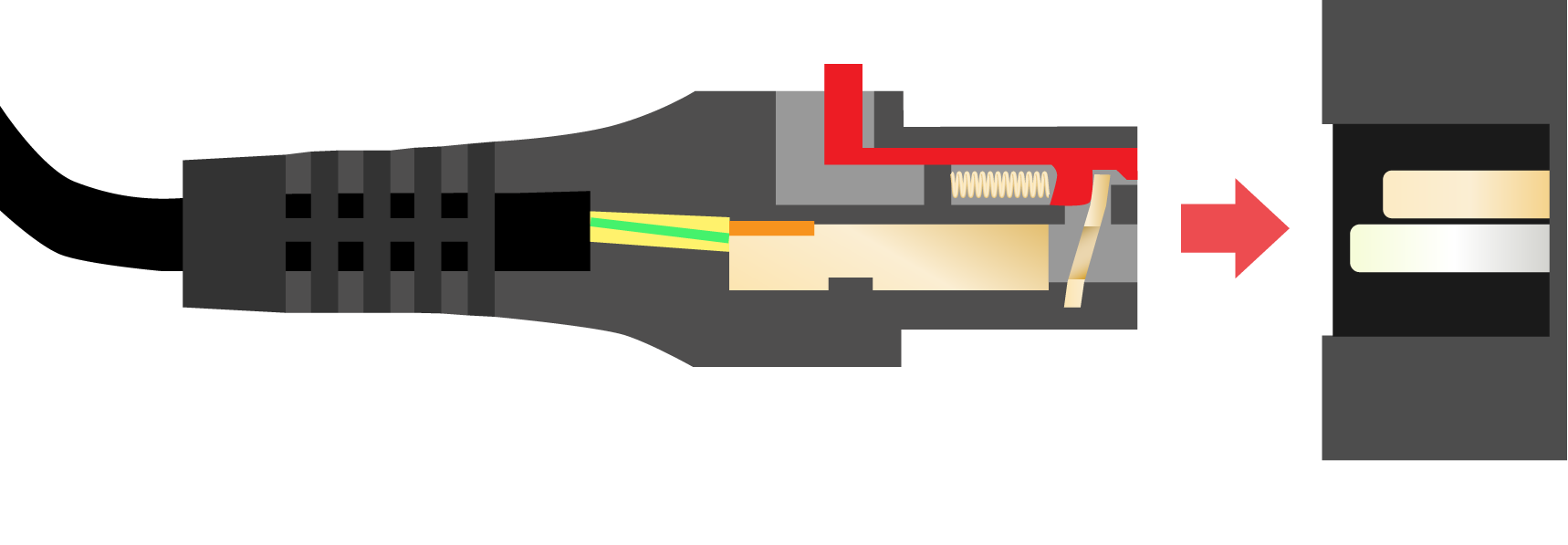 В подключенном состоянии разъем автоматически фиксируется, закрепляясь стопорной пластиной подпружинивающего механизма за средний контакт штекера.