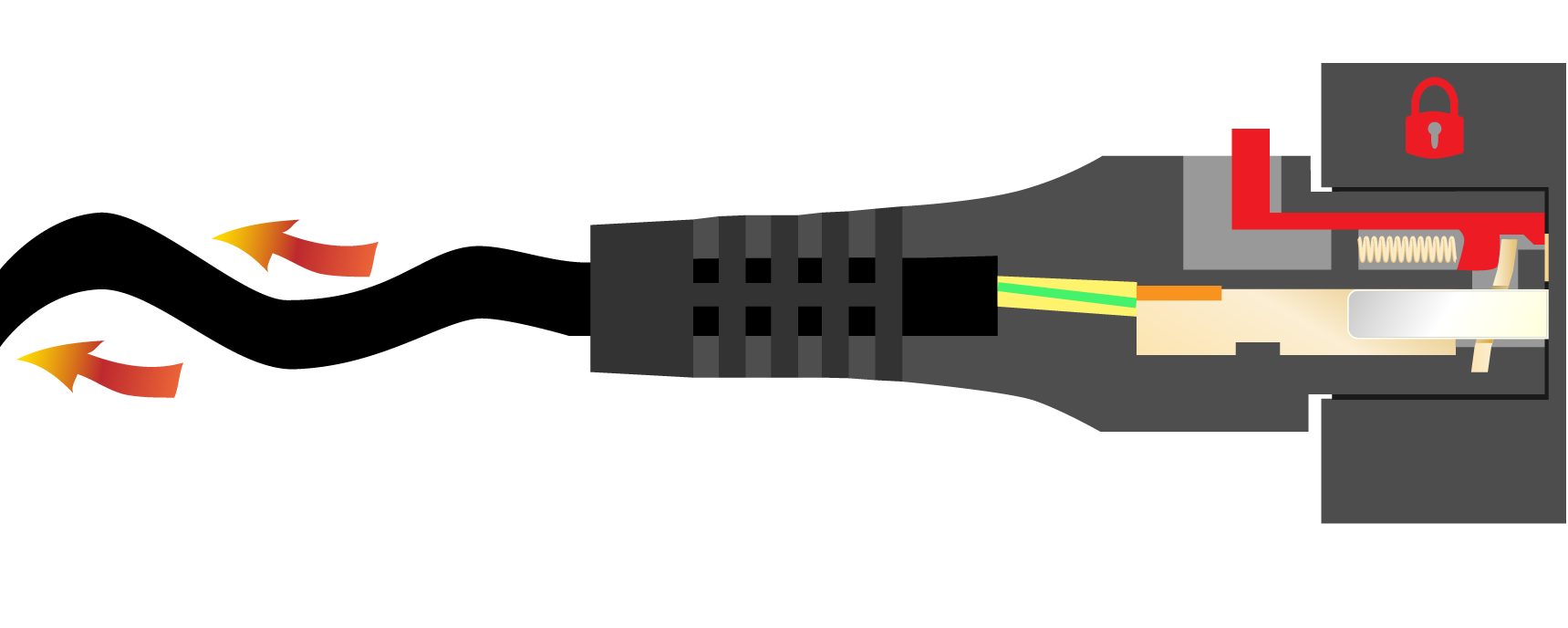 В подключенном состоянии разъем автоматически фиксируется, закрепляясь стопорной пластиной подпружинивающего механизма за заземляющий контакт штекера.