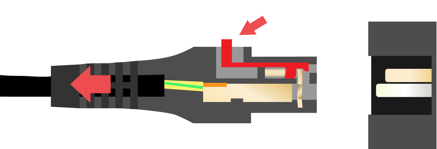 Разомкнуть соединение можно при помощи нажатия на кнопку отключения фиксатора и вытягивания штекера из разъема